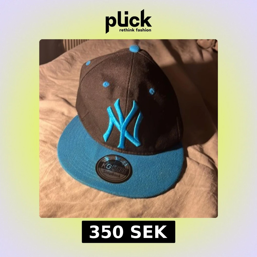 Säljer en snapback-keps från New York Yankees med svart krona och blå skärm. Kepsen har blå broderade detaljer, inklusive NY-loggan fram och MLB-loggan bak. Justerbar storlek med blå plastrem. Perfekt för dig som vill ha sportig streetstyle.