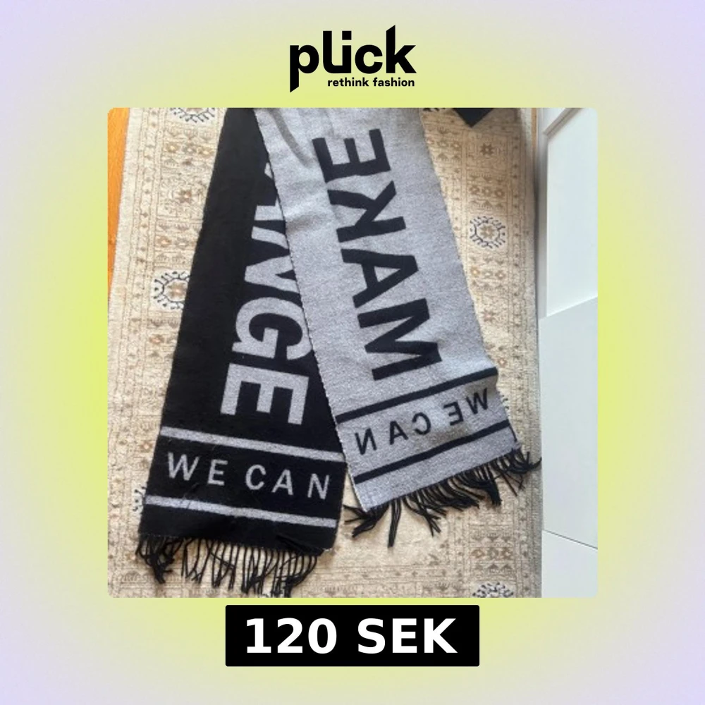 Snygg halsduk i svart och grått med stora bokstäver och texten 'WE CAN MAKE CHANGE'. Halsduken har fransar i ändarna och är perfekt för att ge din outfit en cool touch. Tjockt och mjukt material som håller dig varm.