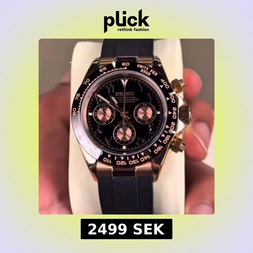 Elegant klocka från Seiko med svart urtavla och guld detaljer. Klockan har tre sub-dials och en svart bezel med guldmarkeringar. Armbandet är svart och matchar den stilrena designen perfekt.