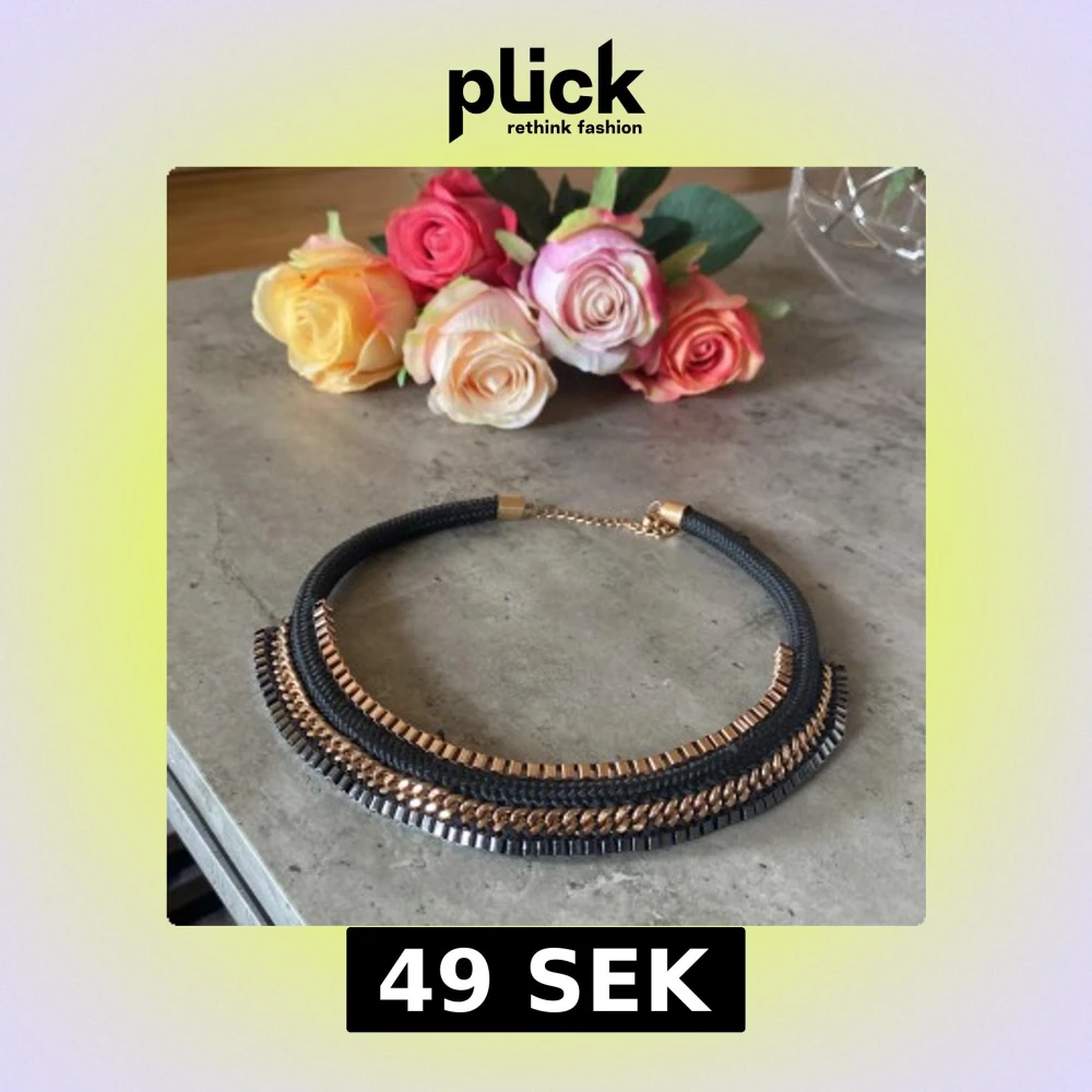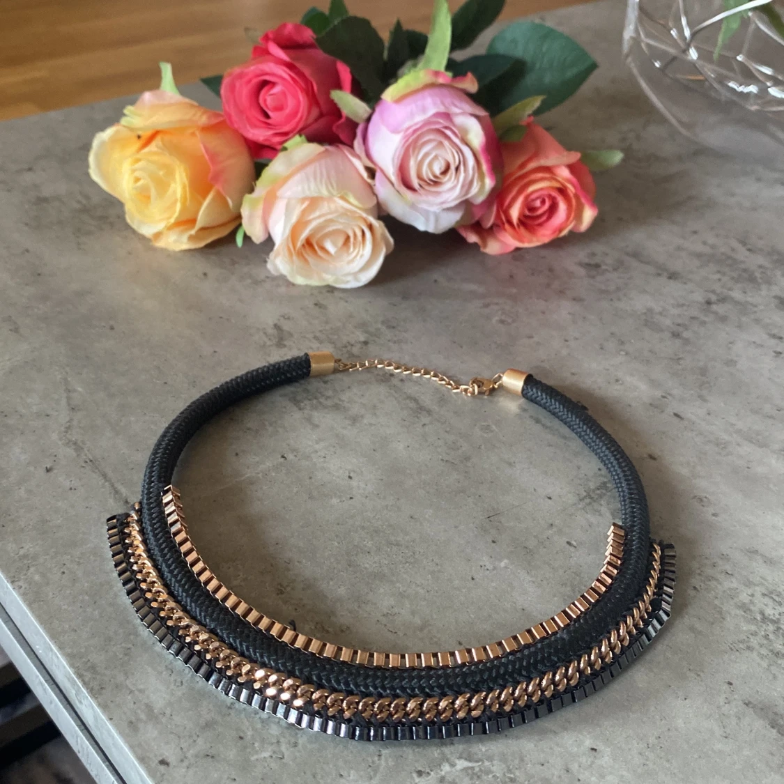 Snyggt statement-halsband med svart flätad textil och detaljer i guld och mörkgrå metall. Halsbandet har flera lager med kedjor och fyrkantiga länkar som ger en cool och modern look. Justerbar kedja i nacken för perfekt passform.