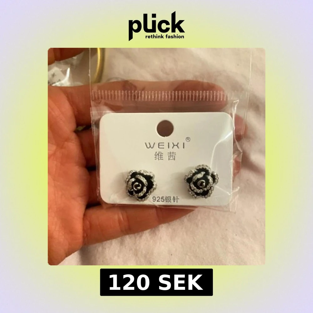 Eleganta örhängen i form av rosor från Weixi. De har en svart bas med silverdetaljer som ger en glittrig effekt. Perfekta för att lägga till en touch av glamour till din outfit.