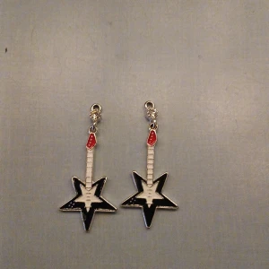 Coola örhängen i form av stjärnor med svart och vit design. De har en röd detalj på toppen och är perfekta för att ge en unik touch till din stil. Passar bra för dig som gillar att sticka ut! Går även att hänga på armband eller halsband, har själv aldrig använt då jag inte har material att fixa men så snygga💕