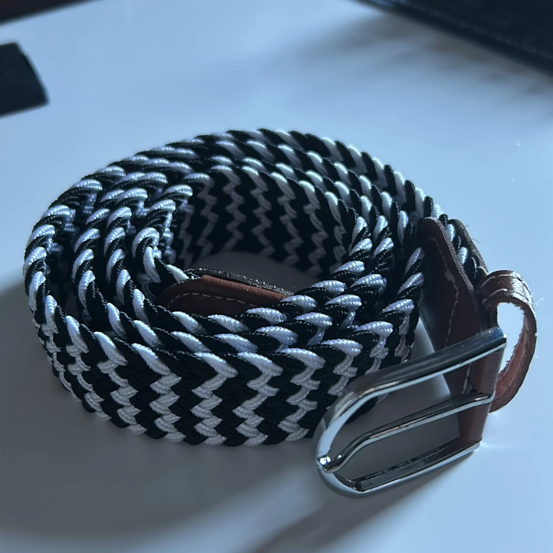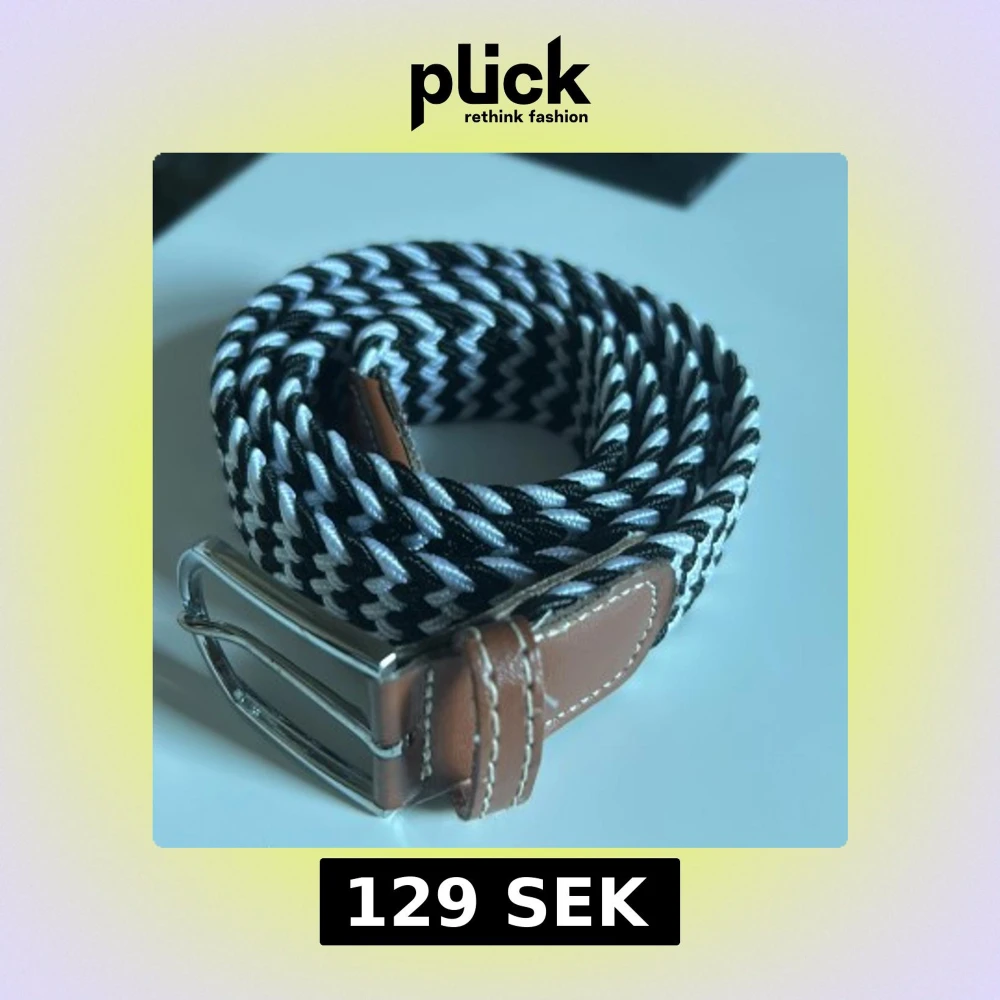 Snyggt flätat bälte i svart och vitt med detaljer i brunt läder. Perfekt för att ge en stilren touch till din outfit. Spännet är i silverfärgad metall. Kommer ej till användning längre och vill ha något nytt bäste istället.