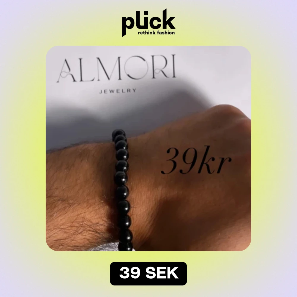 Ett elegant svart pärlarmband från Almori. Armbandet består av runda svarta pärlor och är elastiskt för att passa de flesta handleder.