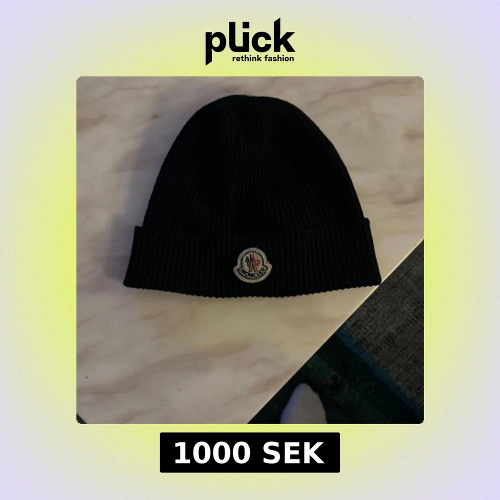 Snygg svart ribbad mössa från Moncler med broderad logotyp framtill. Perfekt för att hålla värmen med stil. Bra skick kvitto kan lösas fram