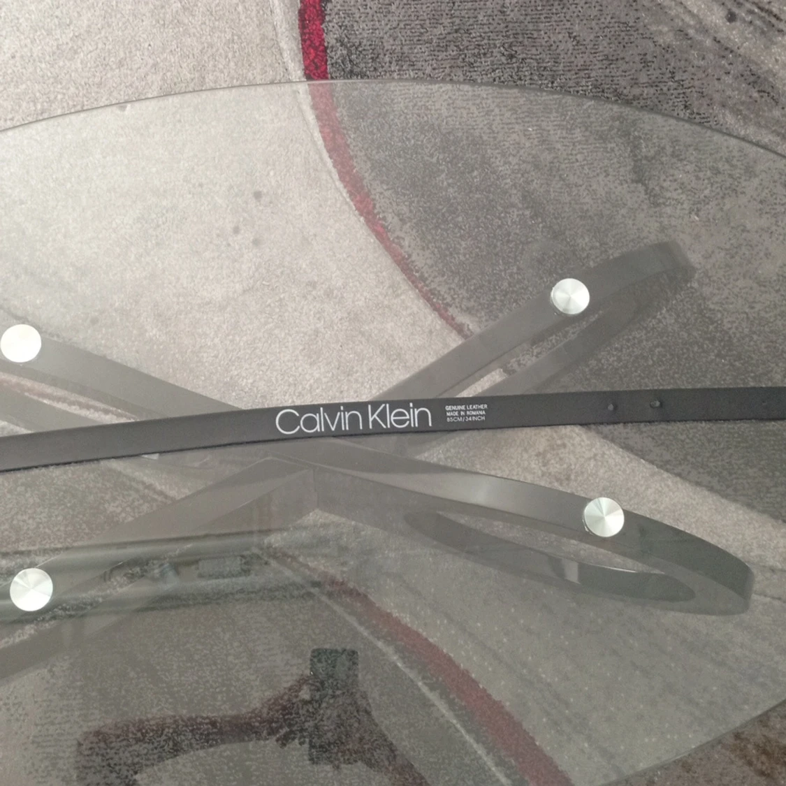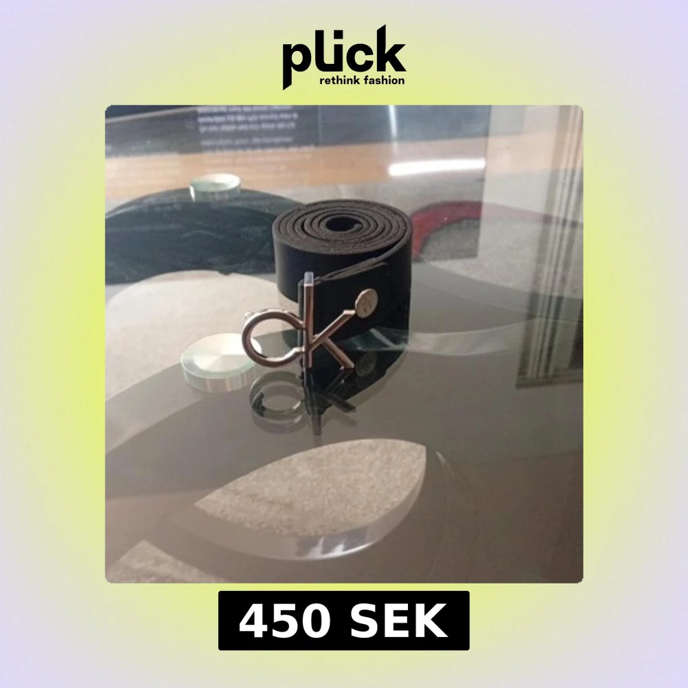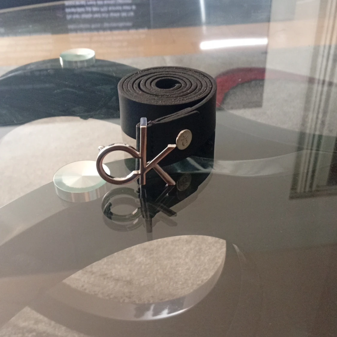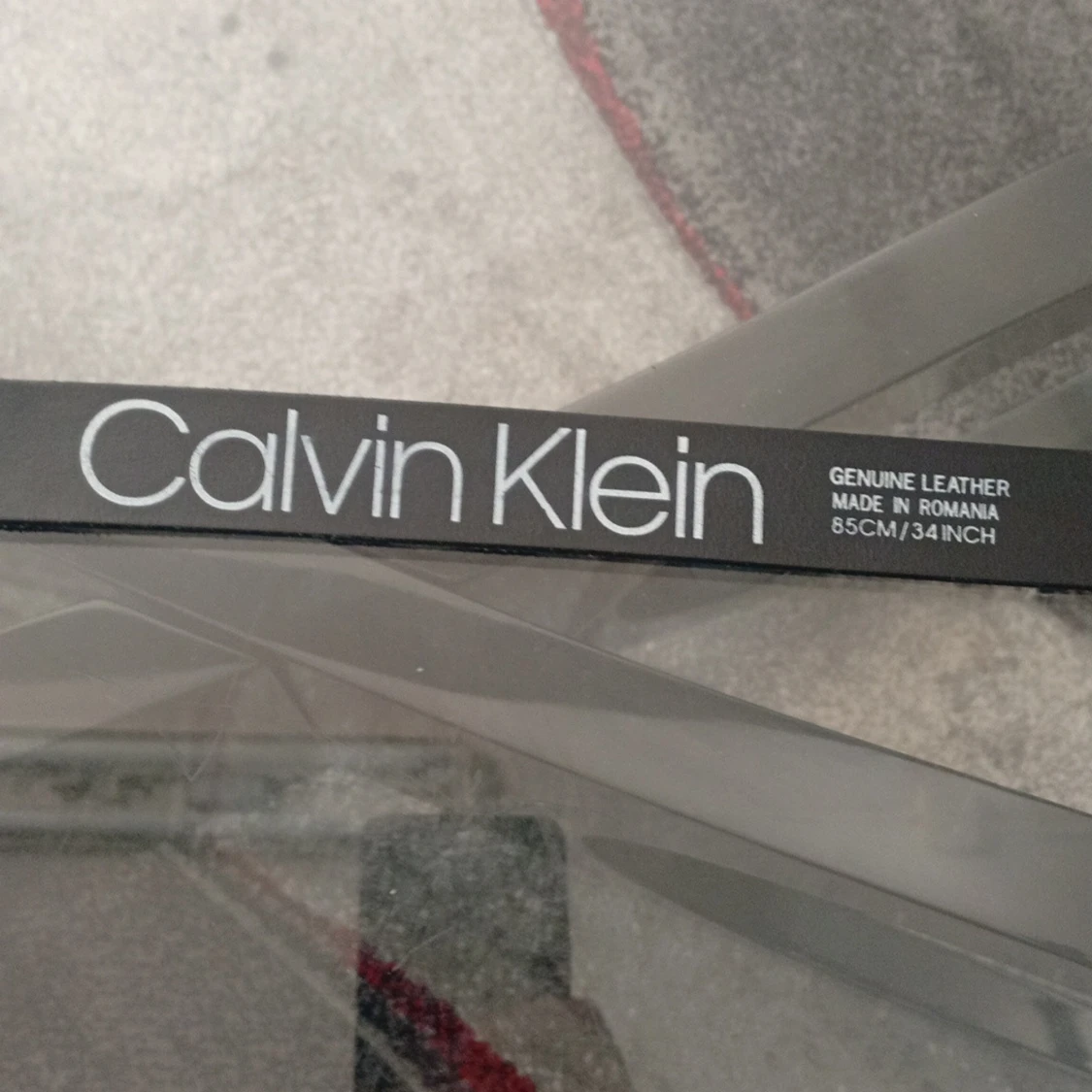 Snyggt svart bälte från Calvin Klein i äkta skinn med stilren CK-logga i silver som spänne. Bältet är smalt och har tydlig Calvin Klein-text på insidan. Perfekt accessoar för att lyfta din outfit.