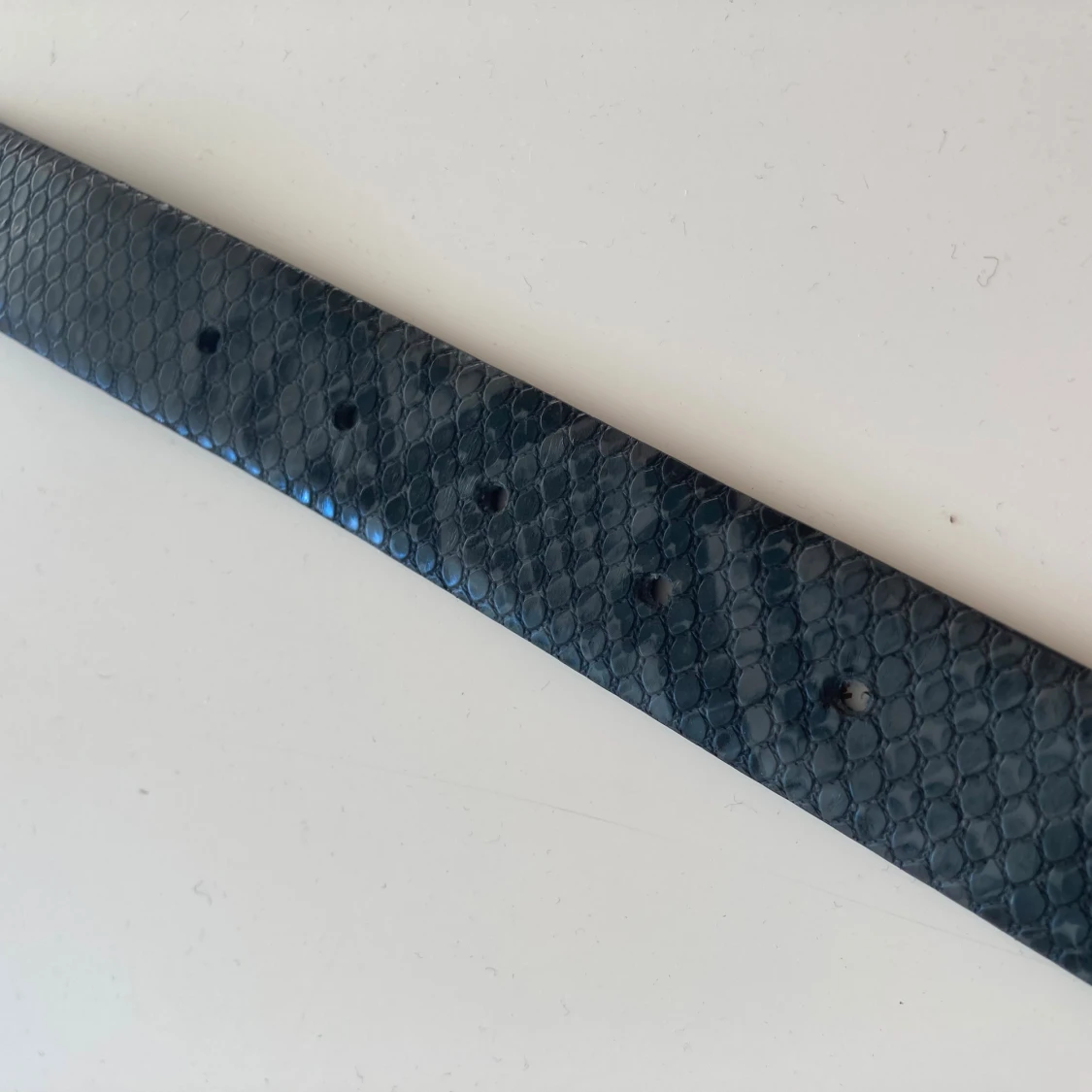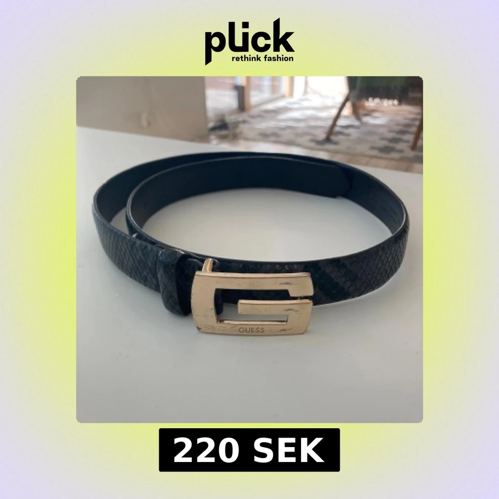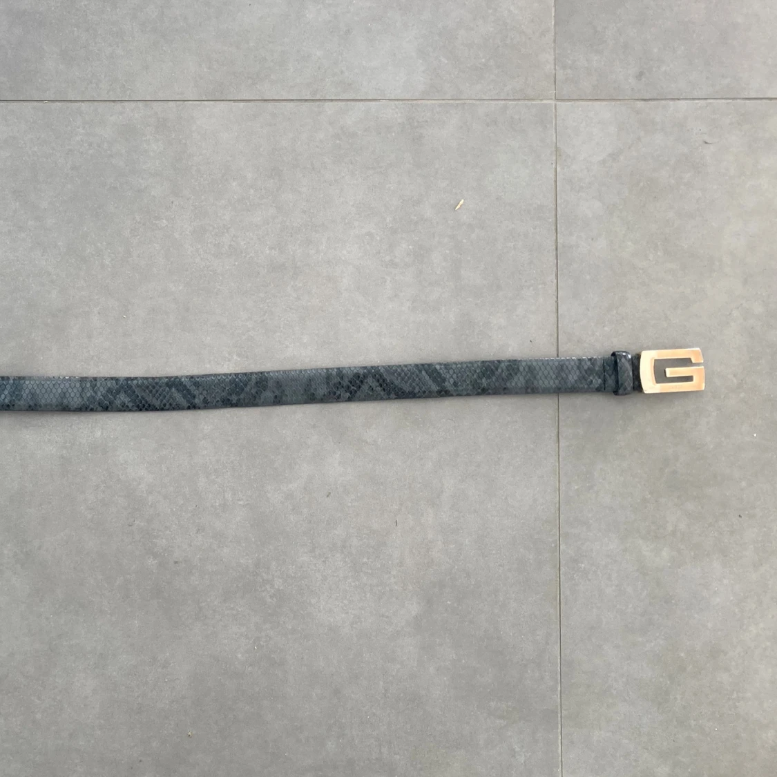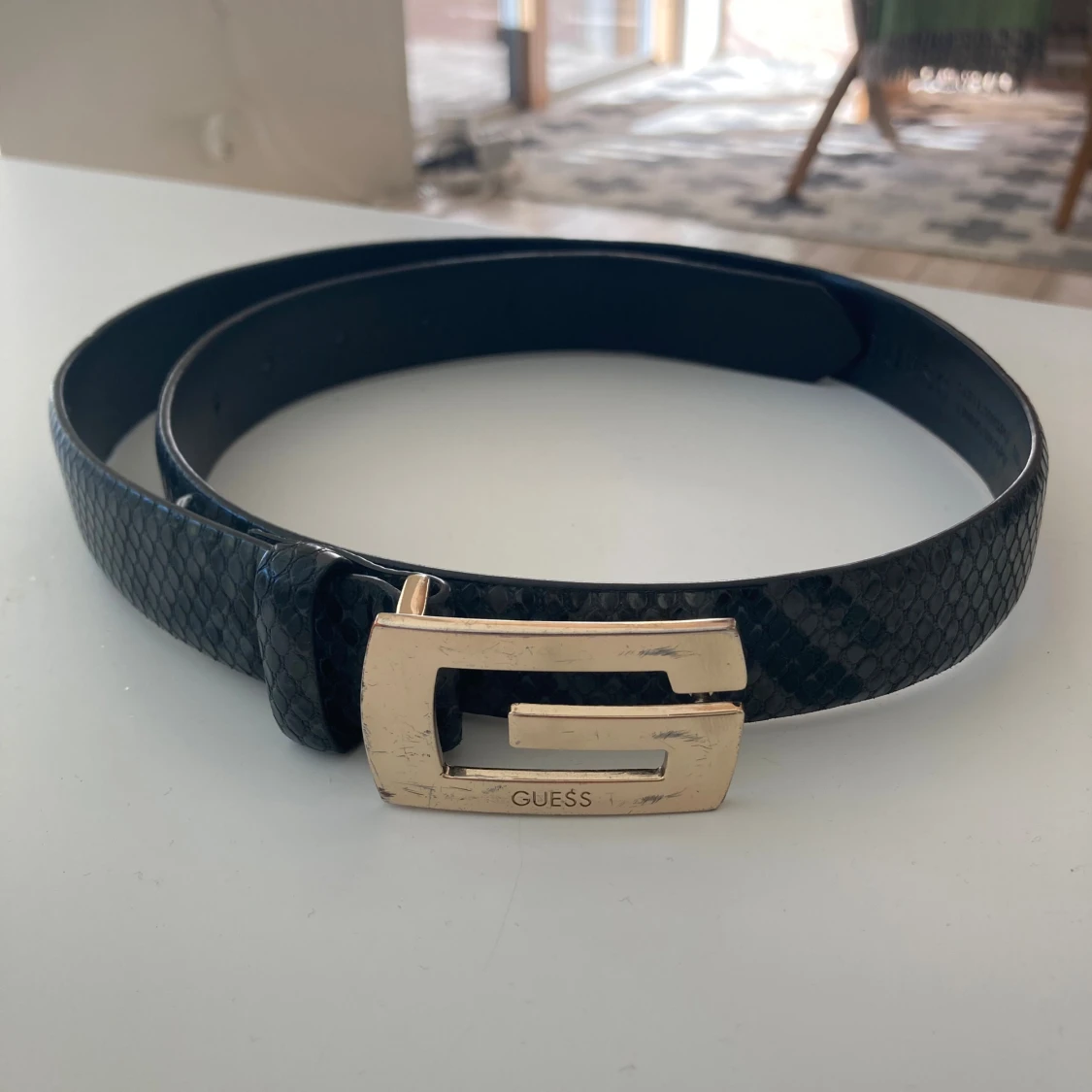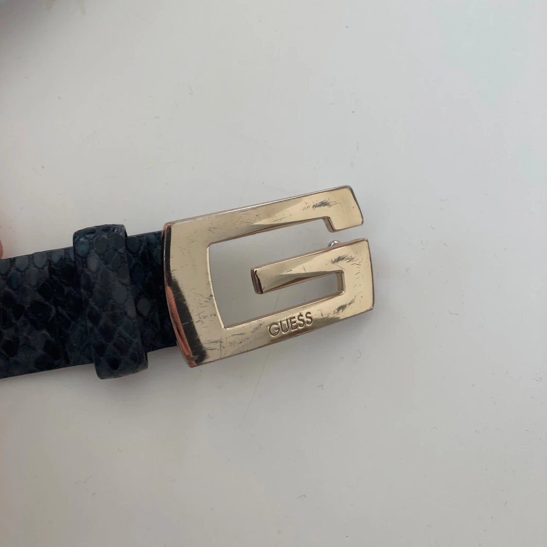 Snyggt svart bälte från Guess med reptilmönstrad yta och ett stilrent G-format spänne i guld. Bältet är smalt och har en modern look. .