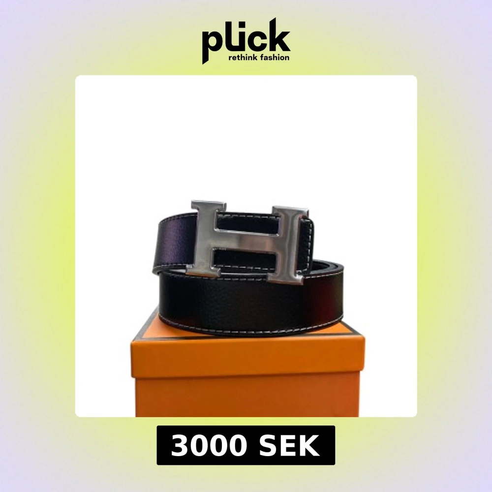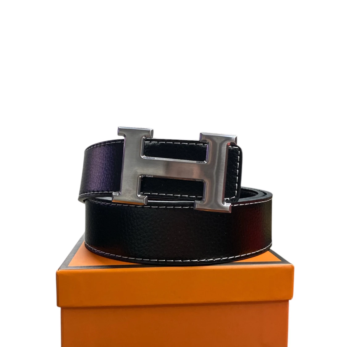 Snyggt svart skärp från med ett stort H-format spänne i silverfärgad metall. Bältet är gjort av skinn med vit kontrastsöm längs kanterna och har en klassisk, stilren design som lyfter vilken outfit som helst.