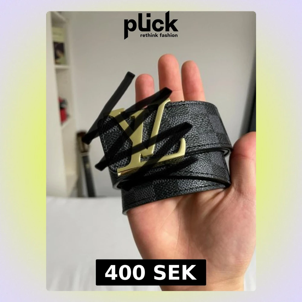Exklusivt bälte i svart skinn med diskret rutigt mönster och ikoniskt spänne i guld. Insidan är ljusbrun och har präglad logga. Perfekt accessoar för att lyfta din outfit med lyxig vibe.