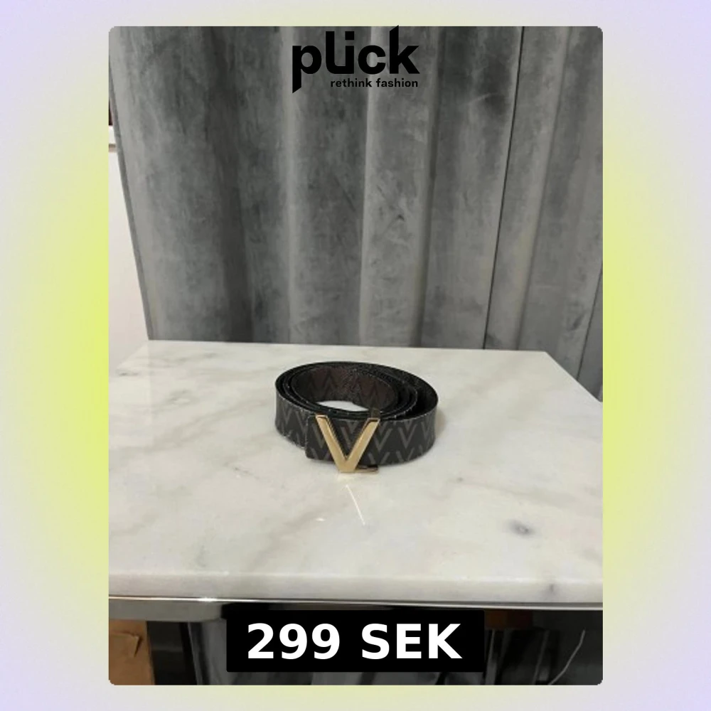 Snyggt svart bälte från Valentino med ett stort V-format spänne i guld. Bältet har ett mönster med gråa V-symboler längs hela remmen och är tillverkat i skinn. Perfekt accessoar för att lyfta din outfit med en exklusiv touch.