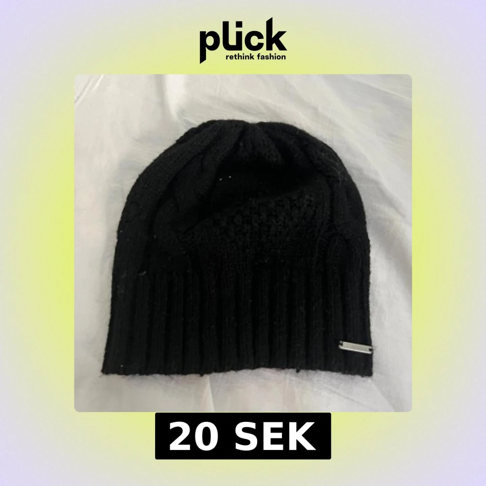 Svart stickad mössa från Everest med diskret mönster och ribbad kant. Mössan har en liten metallbricka med logga framtill