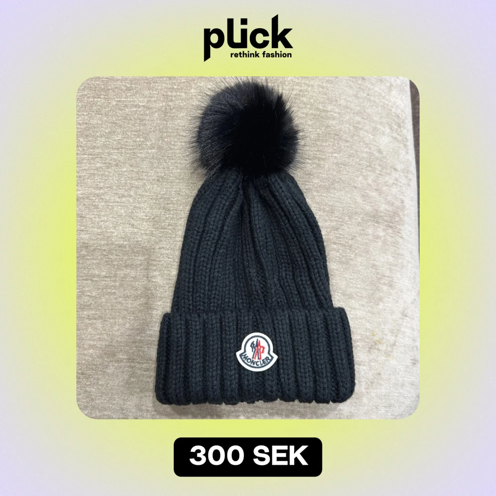 Säljer en helt ny snygg svart stickad mössa från Moncler med en fluffig äkta pälsboll på toppen. Den har en ribbad design och Moncler-loggan framtill. Perfekt för att hålla sig varm och stilren under vintern! Ej orginal.