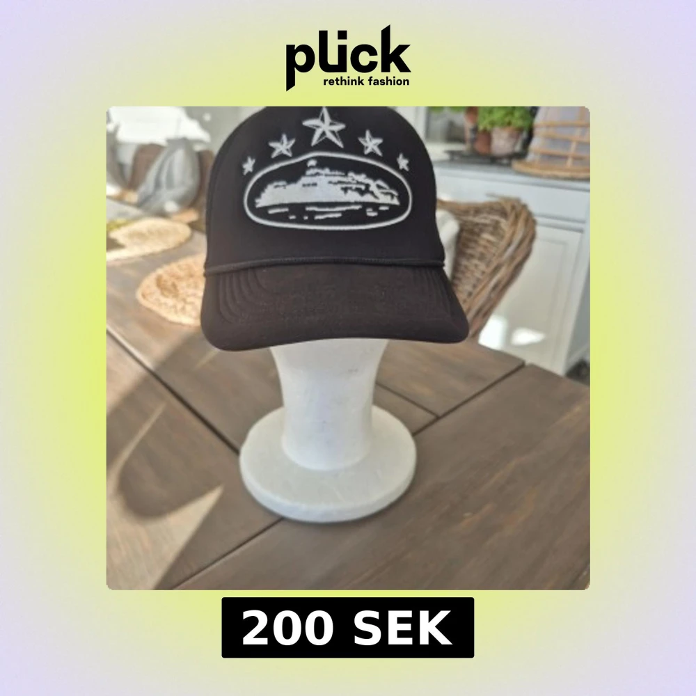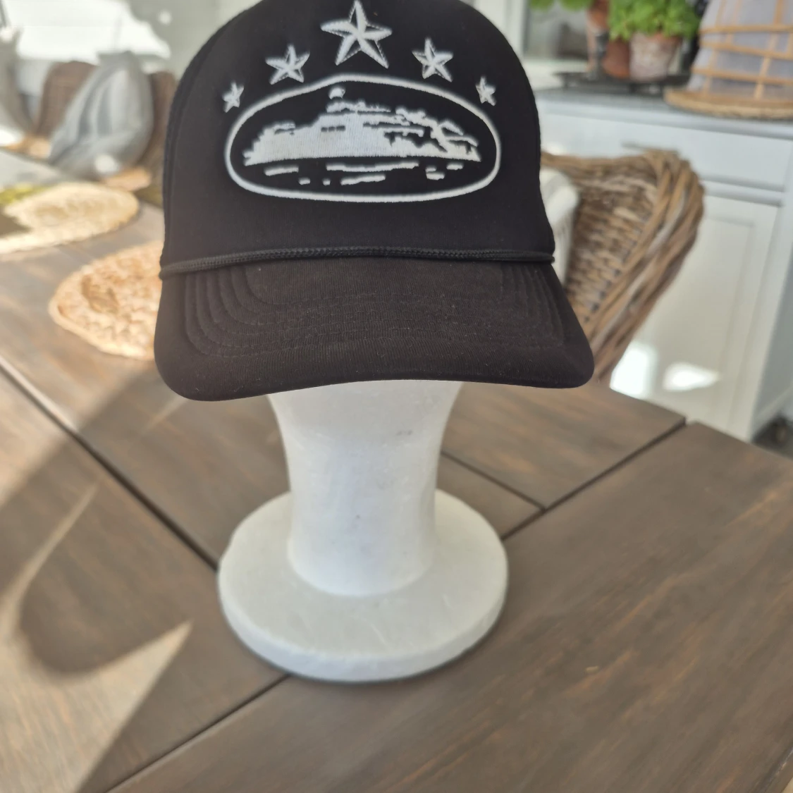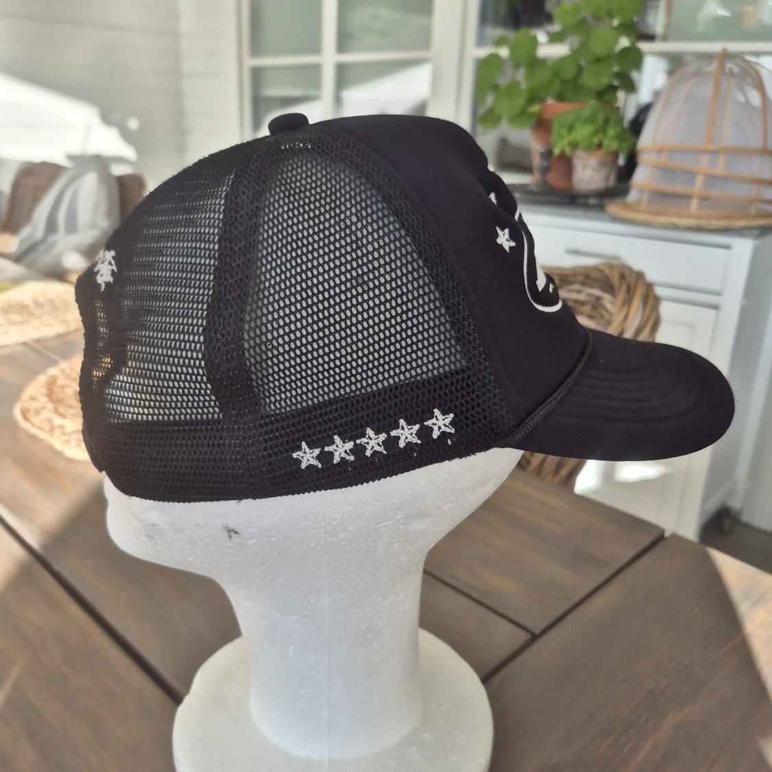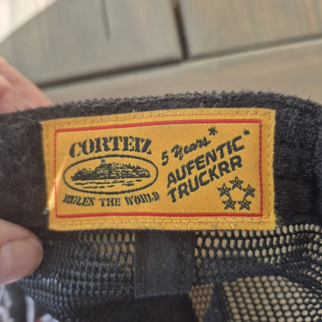Svart truckerkeps från Cortez med vit brodyr framtill och på sidorna, prydd med stjärnor och motiv. Kepsen har mesh på sidorna och bak, samt justerbar snapback. Märkt 'Cortez Rules the World' på insidan. Perfekt för dig som gillar streetstyle.