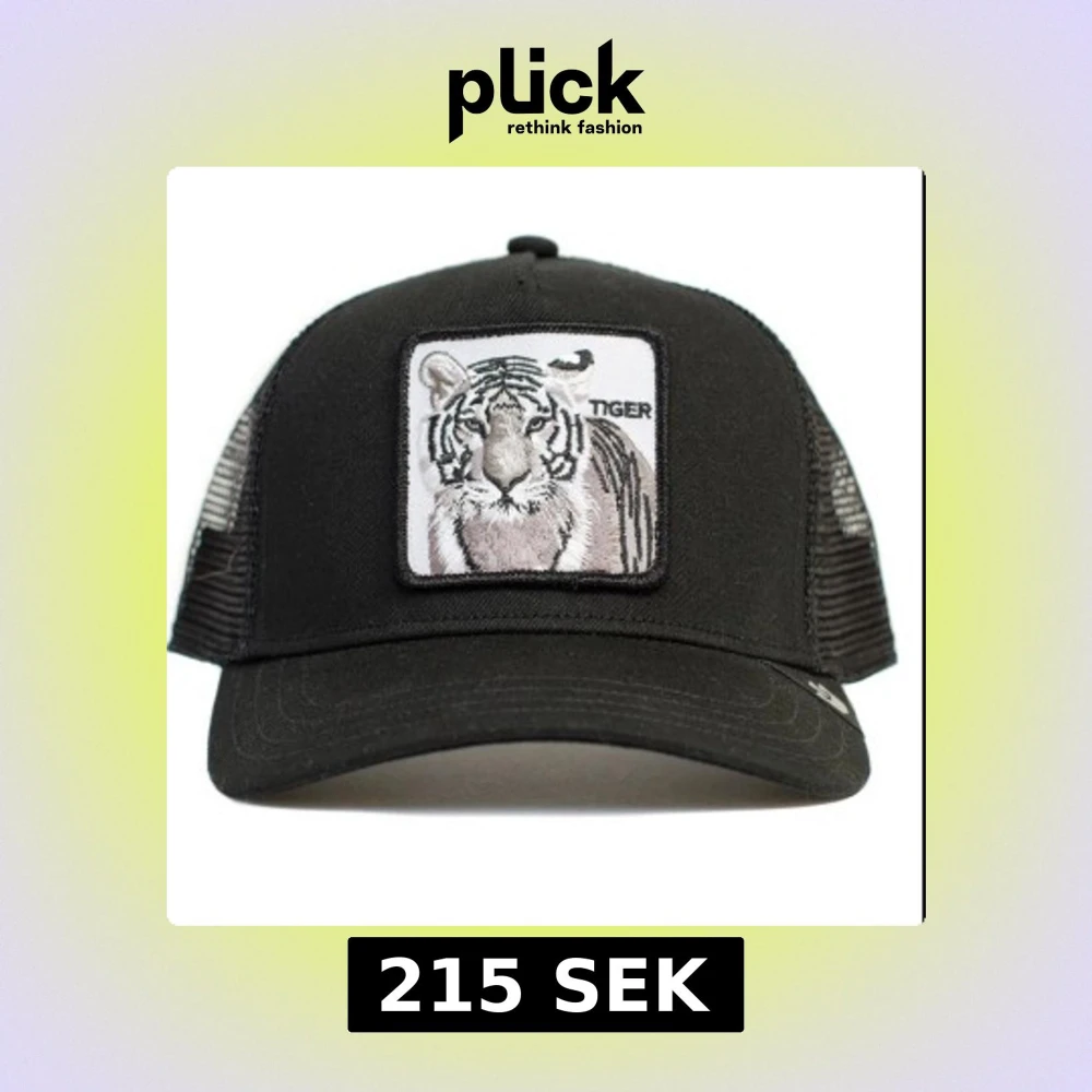 Svart truckerkeps från Goorin Bros med böjd skärm och mesh på sidorna. Framtill sitter en broderad patch med en tiger och texten 'TIGER'. Kepsen har justerbar snapback och cool streetkänsla. Pris kan diskuteras