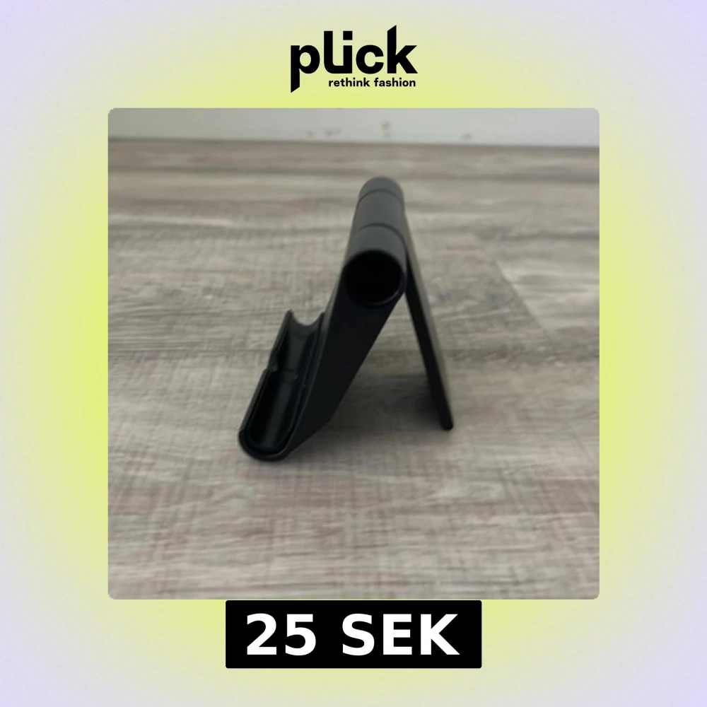 Säljer en svart vikbar mobilhållare i plast. Perfekt för att ställa mobilen på bordet när du kollar på videos eller pluggar. Enkel att fälla ihop och ta med sig i väskan. Stilren och smidig design.