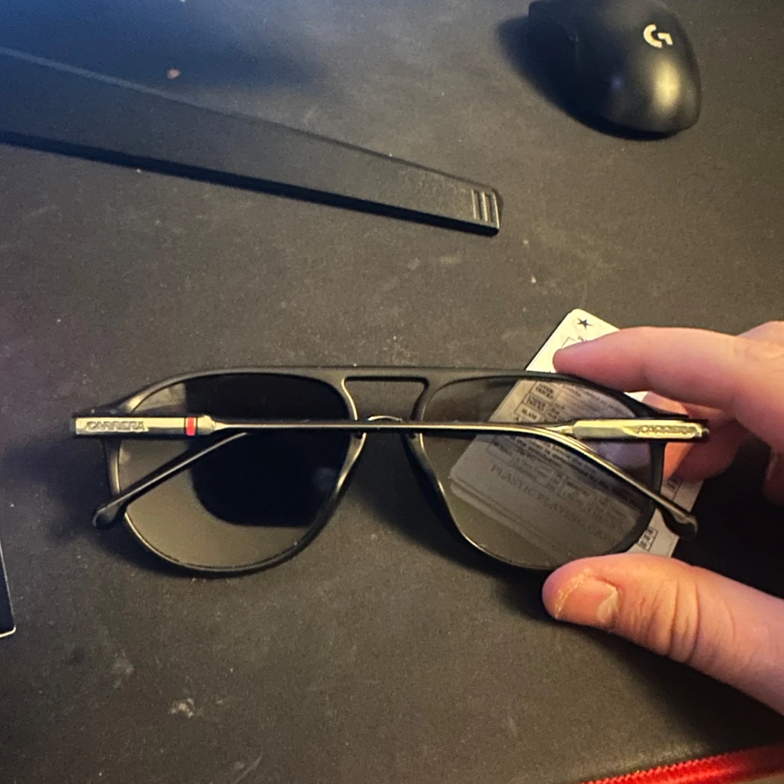 Snygga svarta solglasögon från Carrera med klassisk pilotform. Bågarna är i svart plast med tunna metallskalmar och Carrera-logga på sidan. Mörka linser ger cool look och bra skydd mot solen. Perfekta för dig som vill sticka ut med stil.