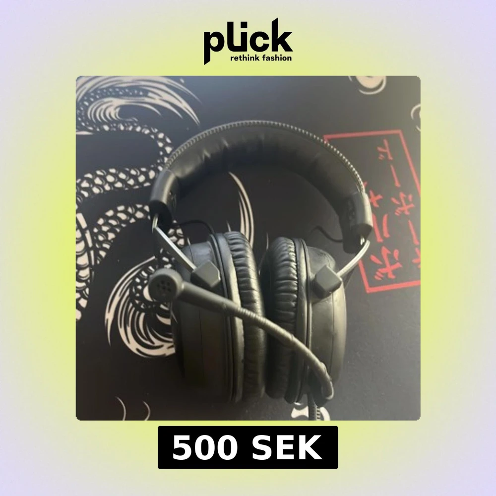 Säljer ett par svarta HyperX hörlurar med inbyggd mikrofon. De har en vadderad huvudbygel och mjuka öronkuddar för extra komfort. Perfekt för gaming eller musiklyssning.