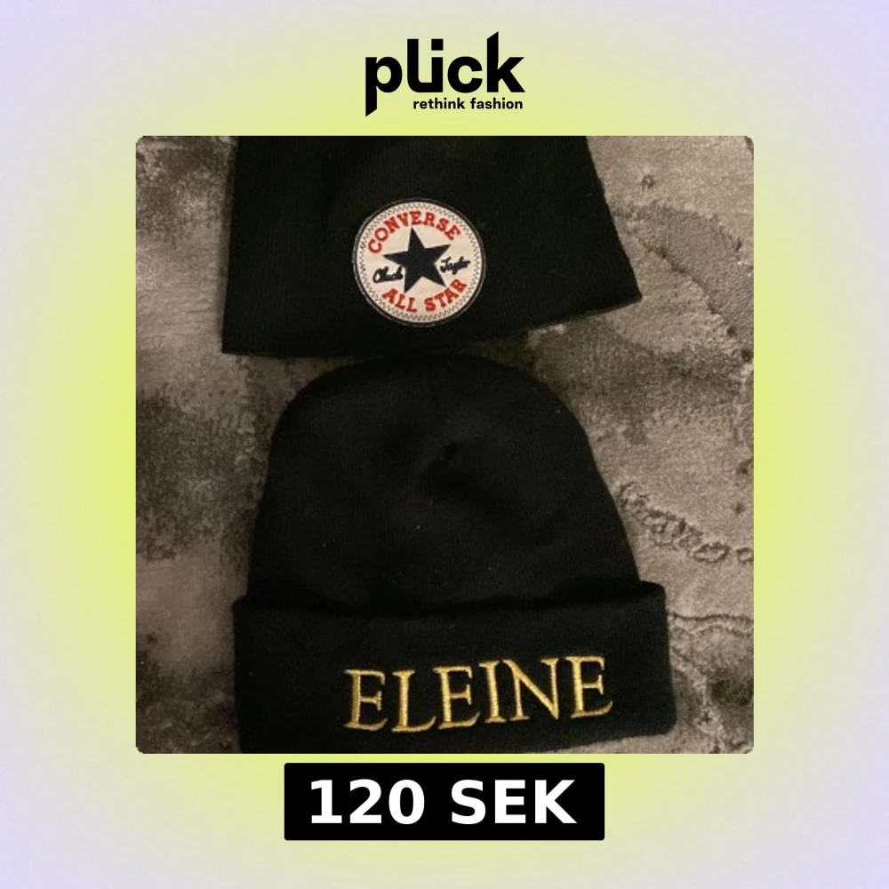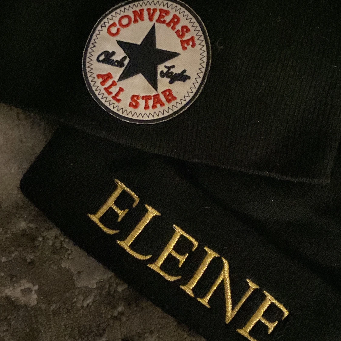 Två svarta mössor: en från Converse med klassisk rund patch med stjärna och röd text, och en med guldbroderad 'ELEINE' framtill. Båda är ribbstickade och har uppvikt kant.