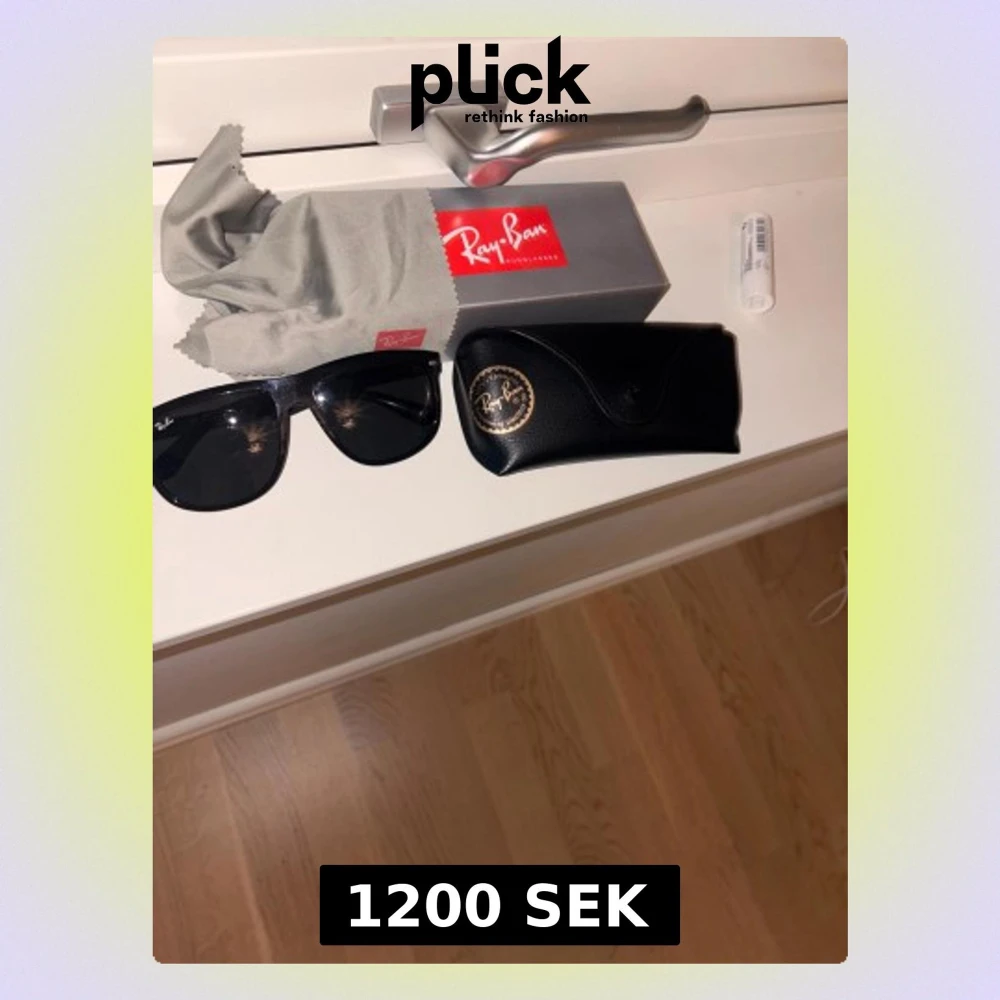 Säljer ett par klassiska svarta Ray-Ban Wayfarer solglasögon med svart båge och mörka linser. Medföljer originalfodral i svart läder, putsduk och Ray-Ban box. Perfekt för dig som vill ha en ikonisk och stilren look.