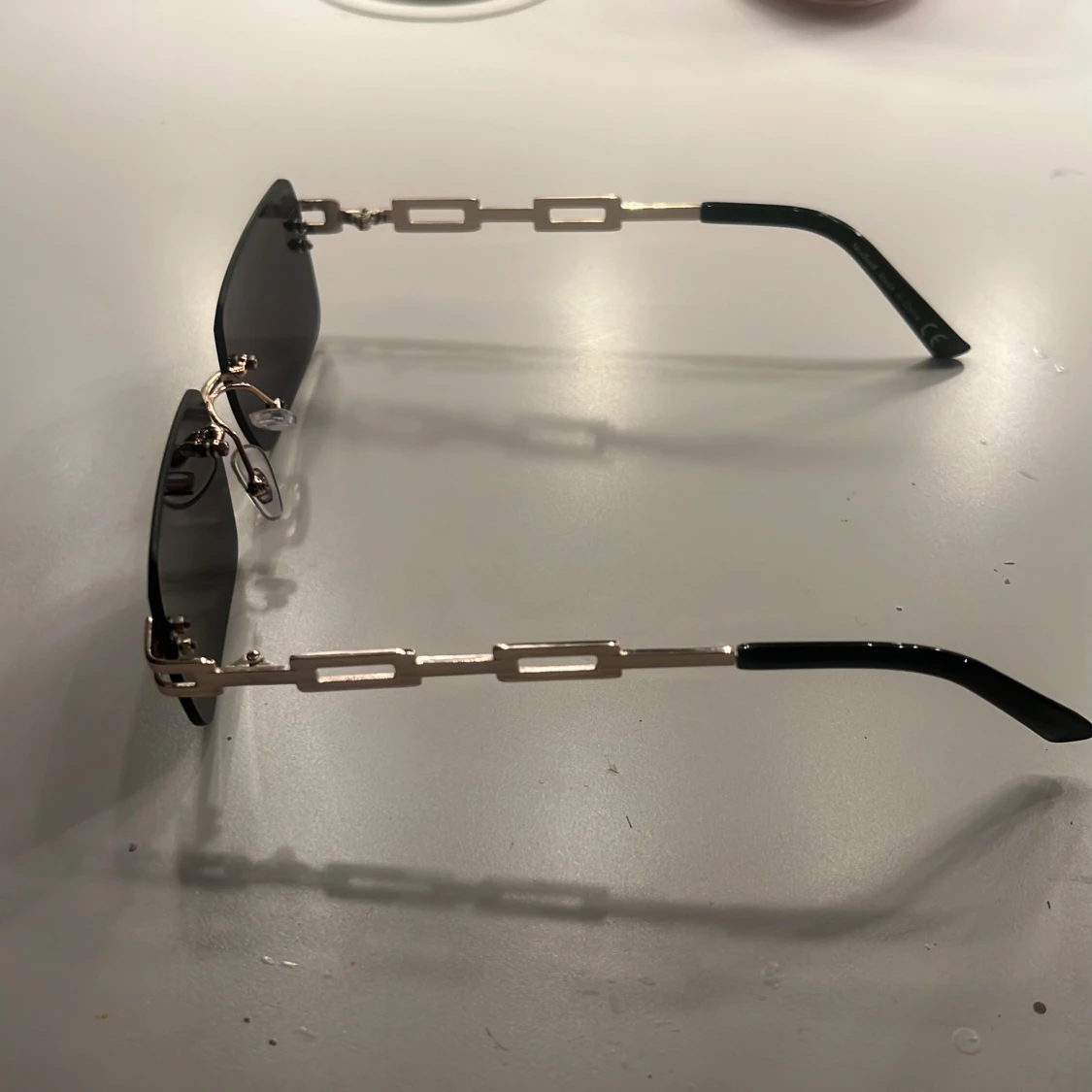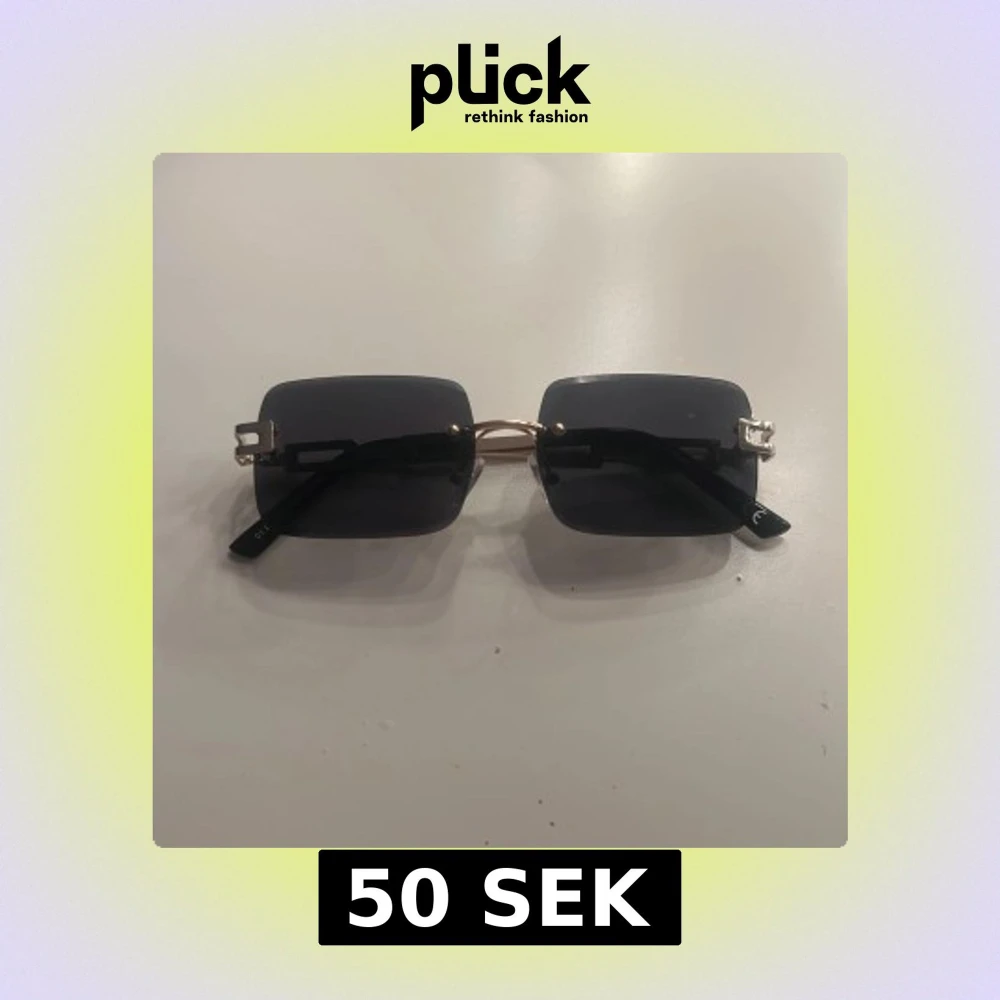 Snygga solglasögon med rektangulära svarta glas och guldfärgade metallbågar. Med guldiga sidor. Pefrekt till dig som vill ha en cool look!