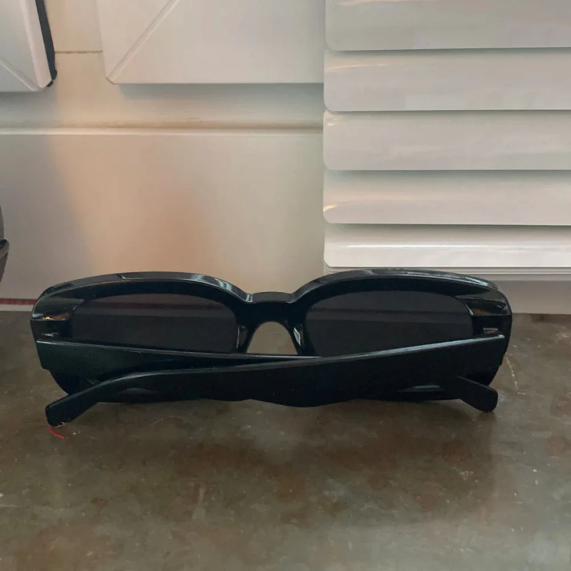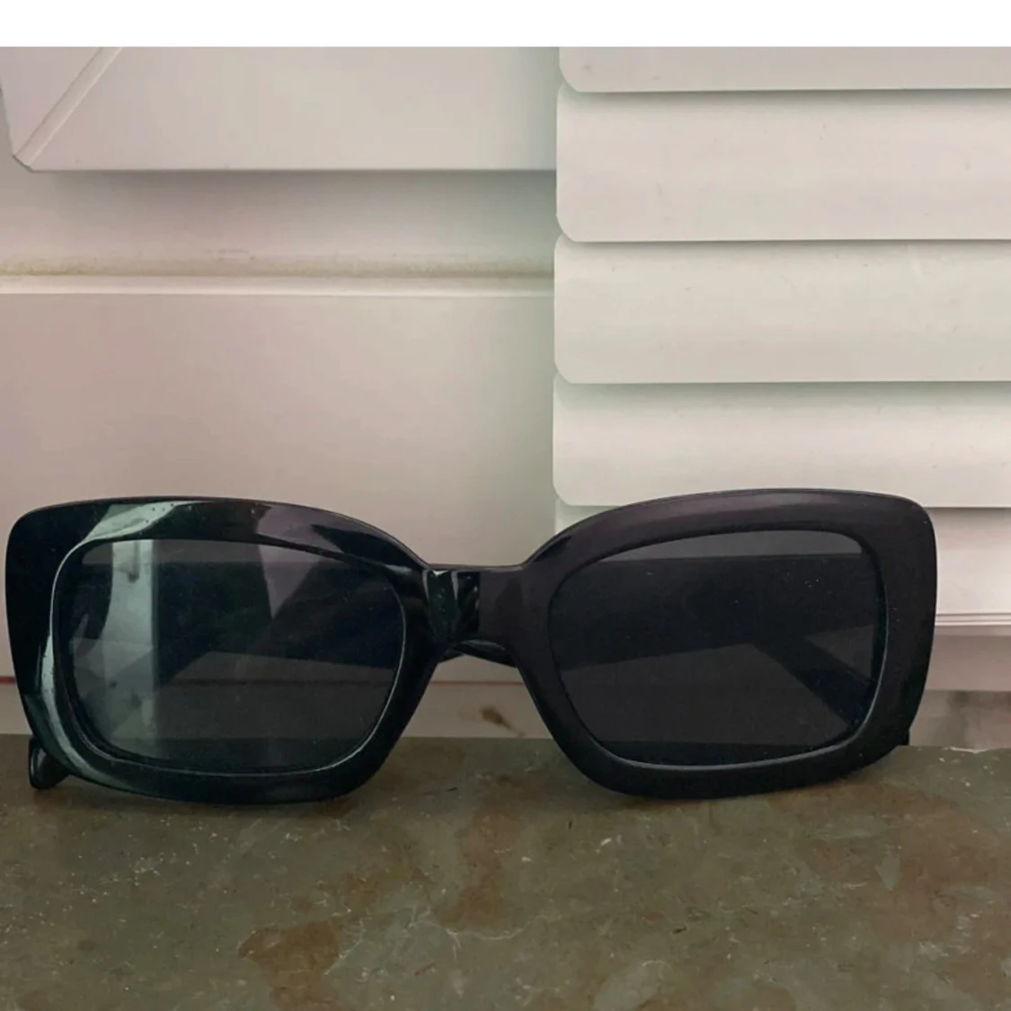 Snygga svarta solglasögon med rektangulära bågar. Perfekta för en stilren look. Passar bra till både vardag och speciella tillfällen.