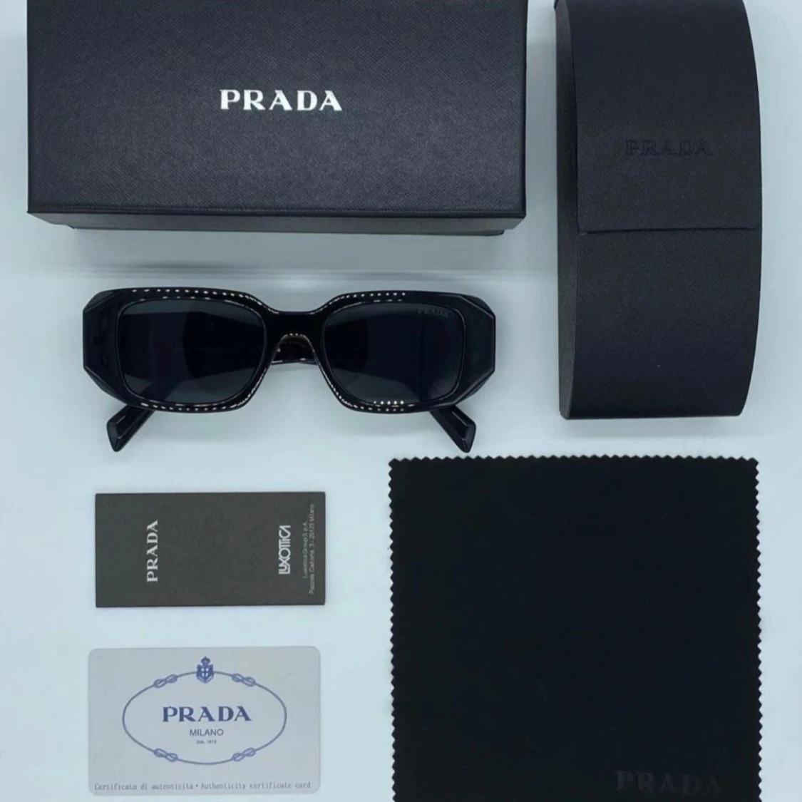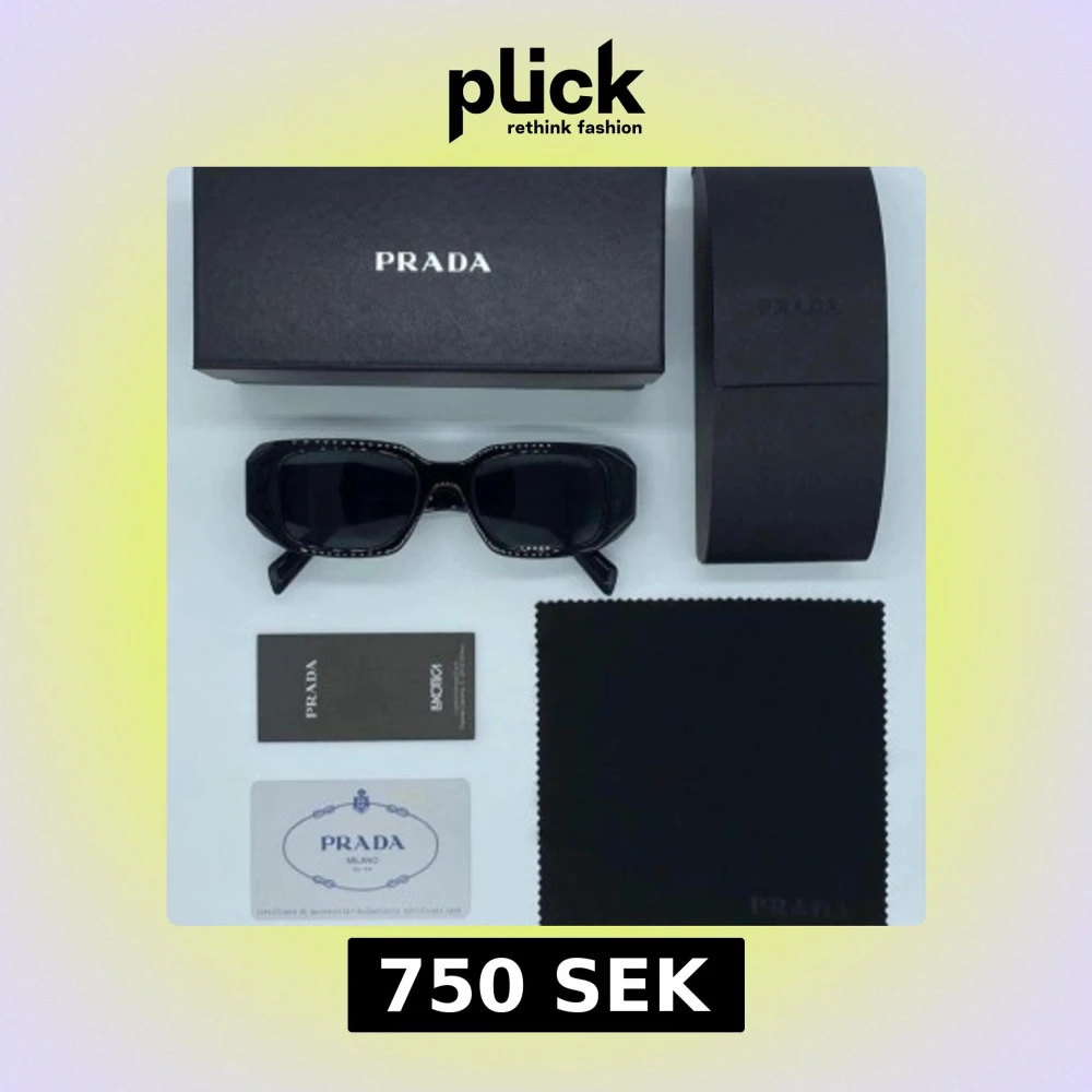 Snygga svarta solglasögon från Prada med rektangulär form och breda skalmar. Bågarna har diskreta silvriga detaljer längs kanterna och logga på sidan. Kommer med originalfodral, putsduk och äkthetskort. Perfekt för dig som vill ha en lyxig och trendig look.