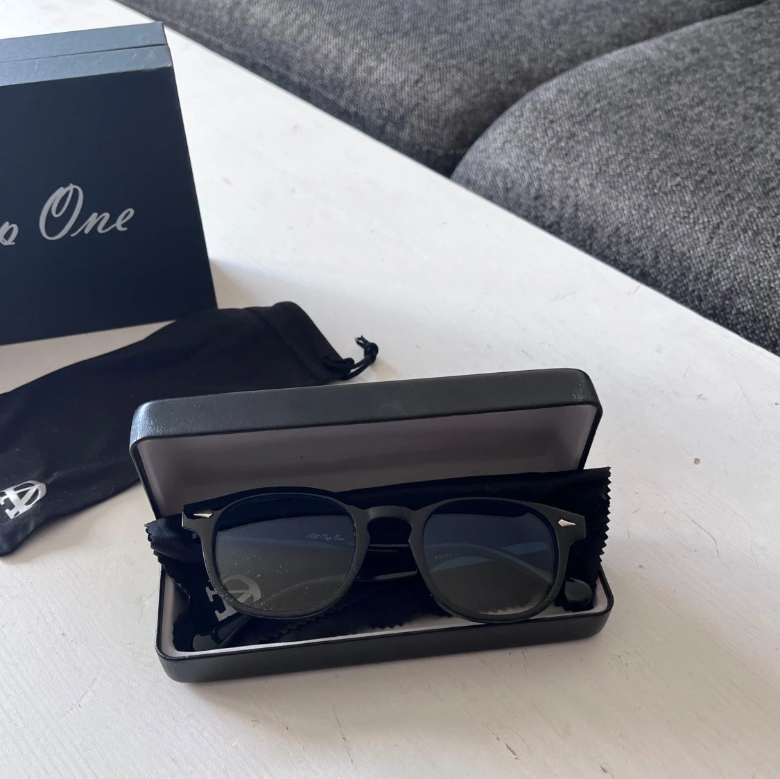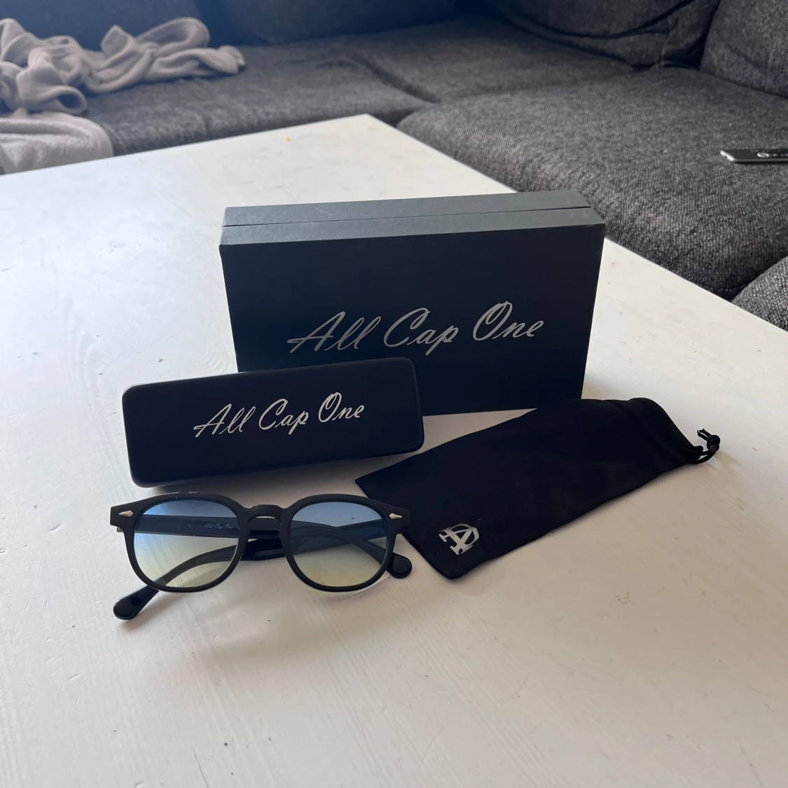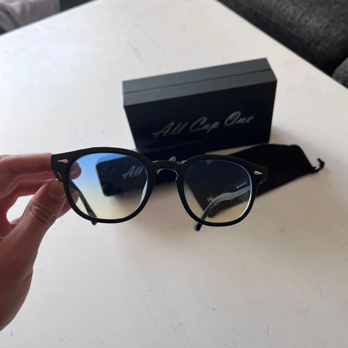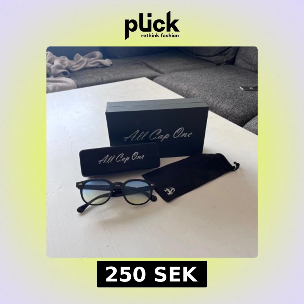 Snygga svarta glasögon från All Cap One med rund form och stilrena detaljer i metall vid bågfästena. Glasen har en lätt toning som går från blått till tan. Kommer med originalfodral och tygpåse. Perfekt accessoar för en clean look.