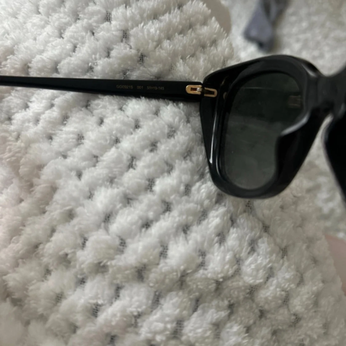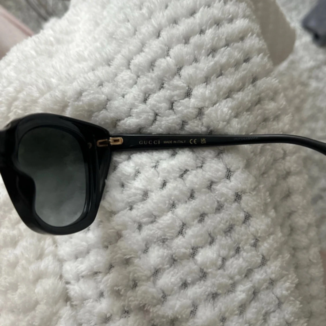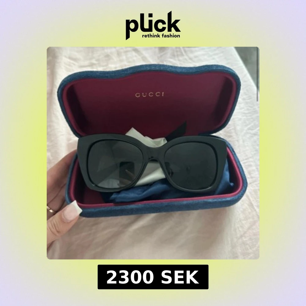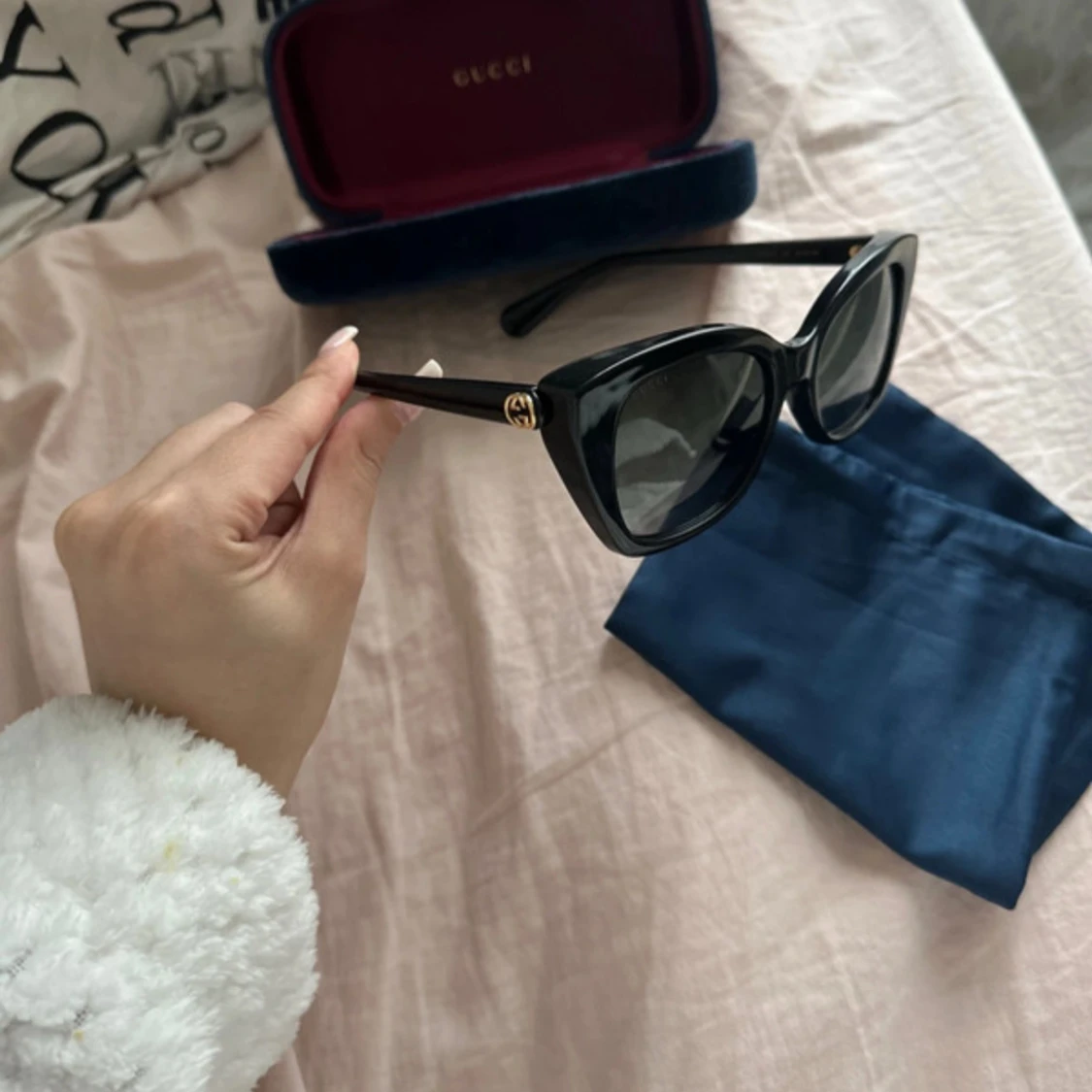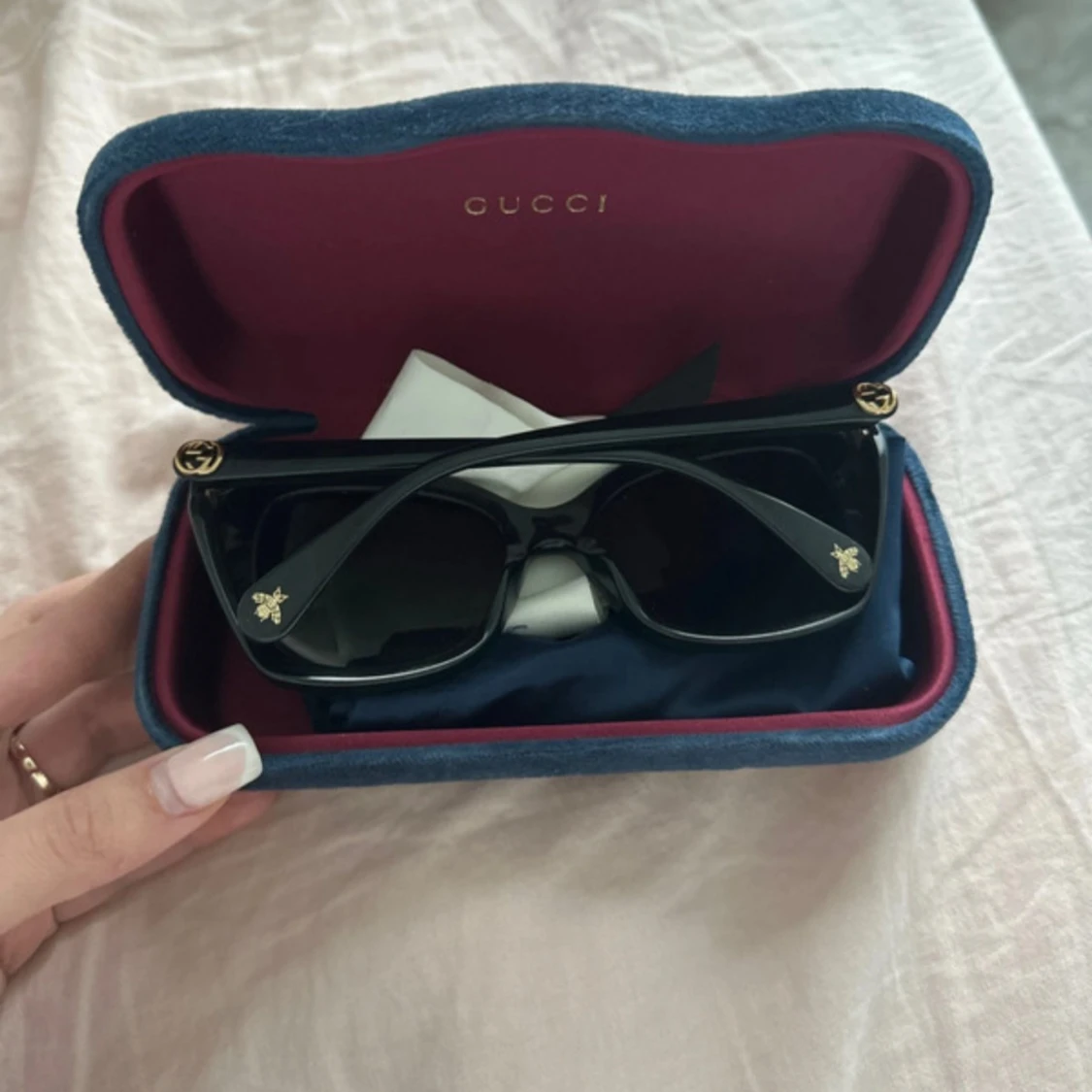 Snygga svarta solglasögon från Gucci med breda bågar och fyrkantig form. Glasögonen har diskreta gulddetaljer vid gångjärnen och små guldfärgade bin på skalmarna. Kommer i originalfodral med röd insida och blå utsida.
