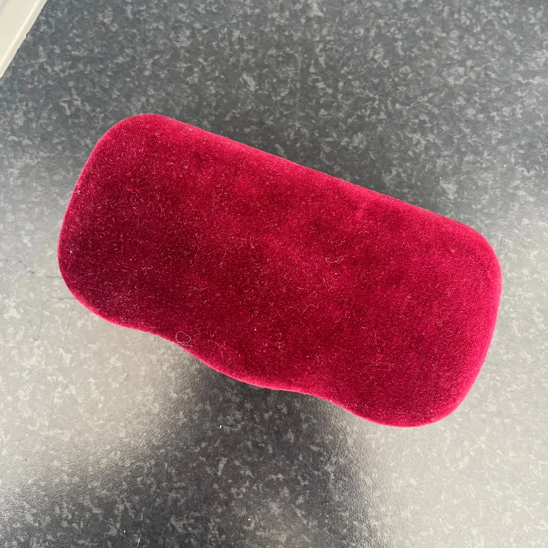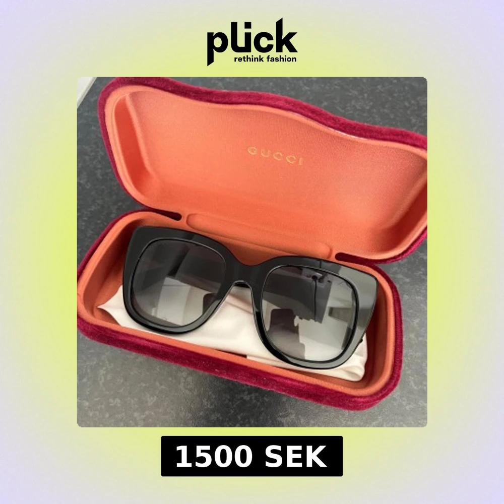 Säljer ett par snygga svarta solglasögon från Gucci med bred båge och fyrkantig form. Glasögonen har diskreta gulddetaljer på skalmarna och kommer i ett lyxigt vinrött fodral med sammet.