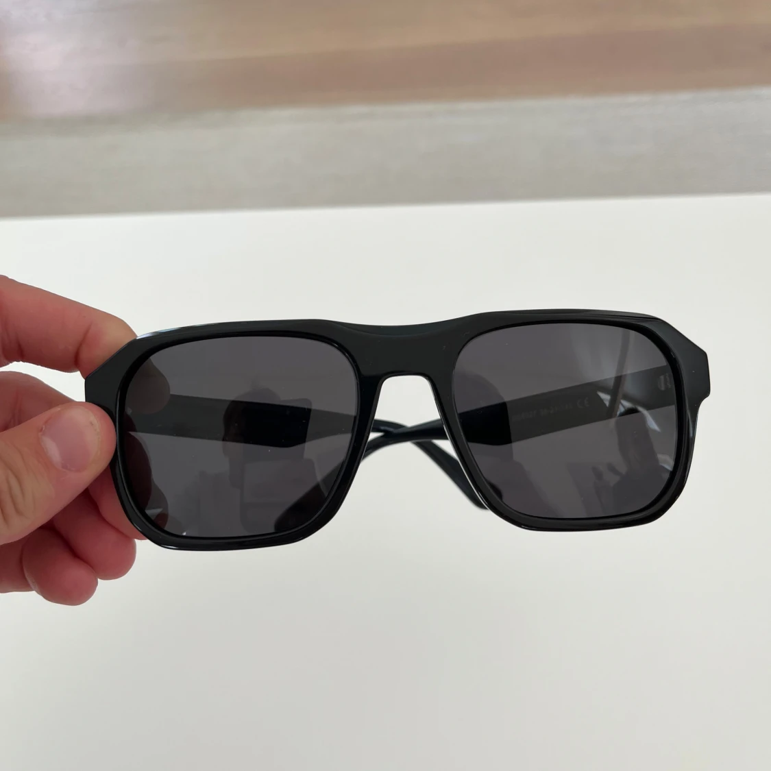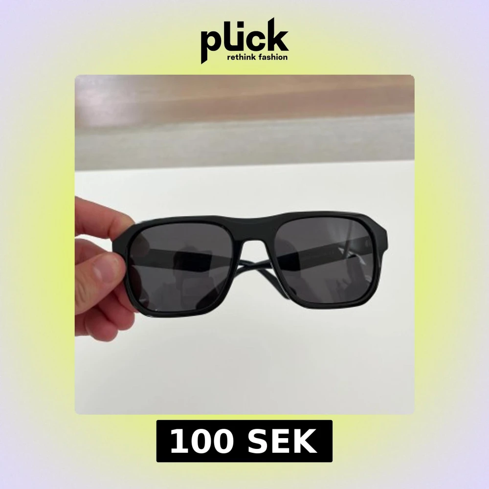 Stilrena svarta solglasögon med bred, fyrkantig båge och mörka glas. Glasögonbox ingår.