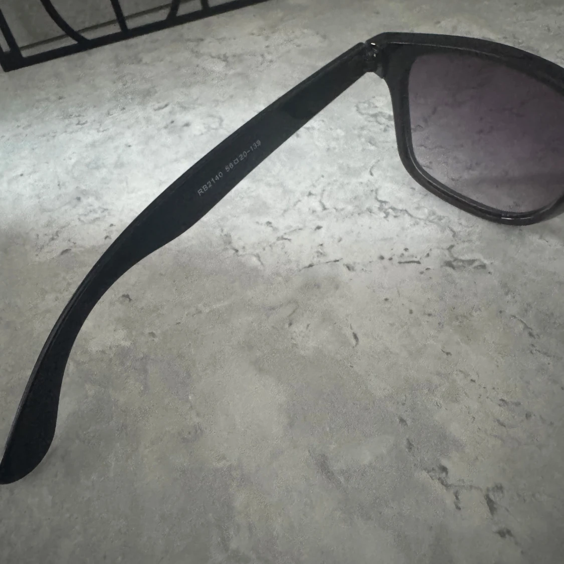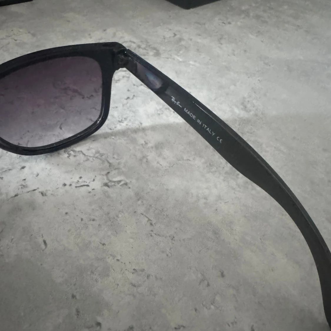 Klassiska svarta Ray-Ban Wayfarer solglasögon med bred båge och mörka glas. Snygg och tidlös design med Ray-Ban-logga på sidan. Tillverkade i Italien och passar perfekt för dig som vill ha en ikonisk look.