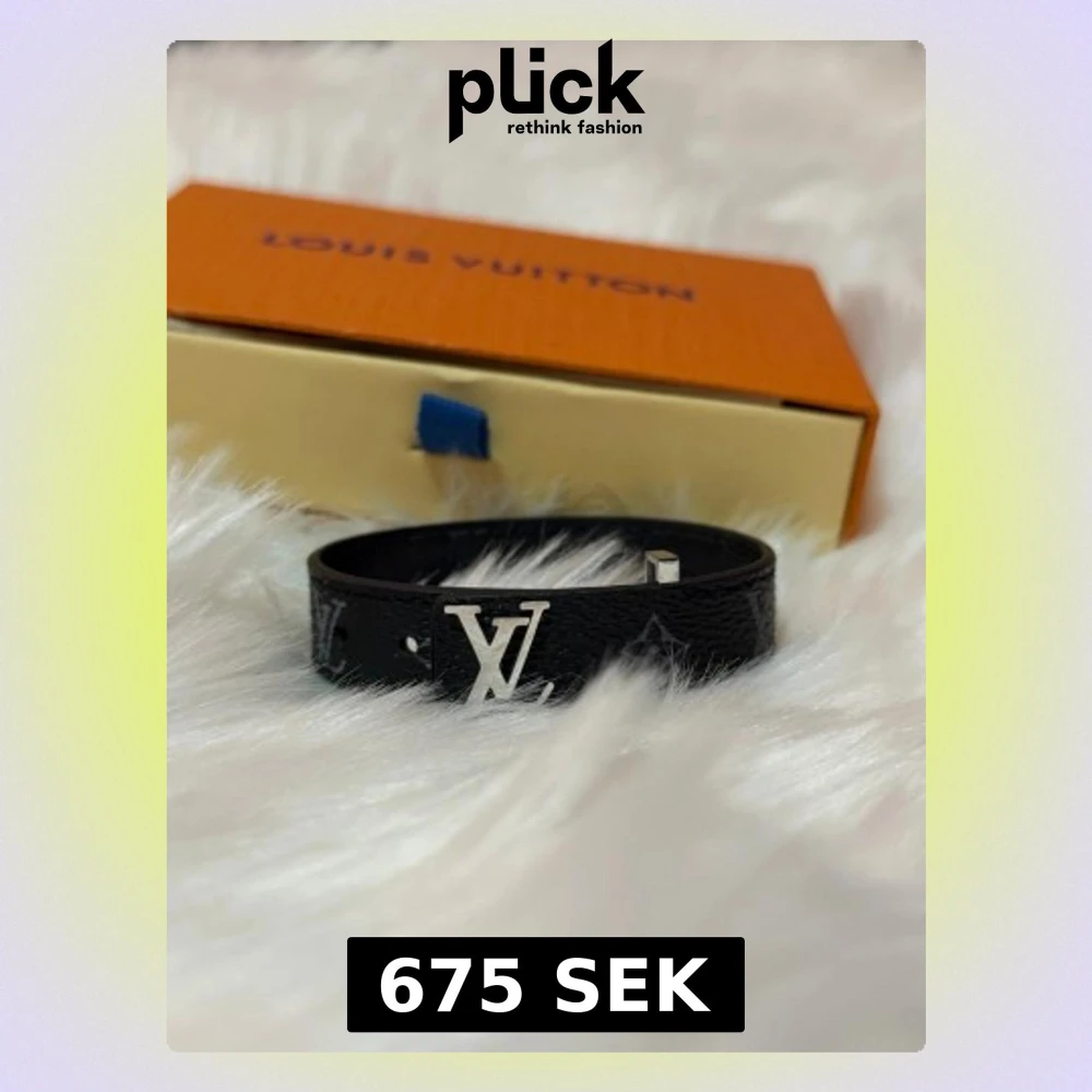 Stilrent svart armband i läder med ikoniska LV-loggan i silverfärgad metall framtill. Armbandet har diskret monogrammönster och justerbart spänne. Perfekt accessoar för att lyfta din outfit med lyxig känsla.