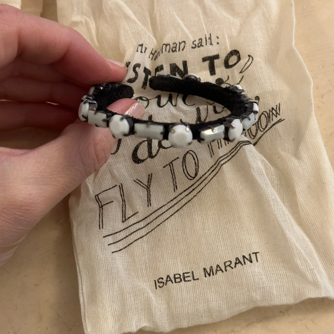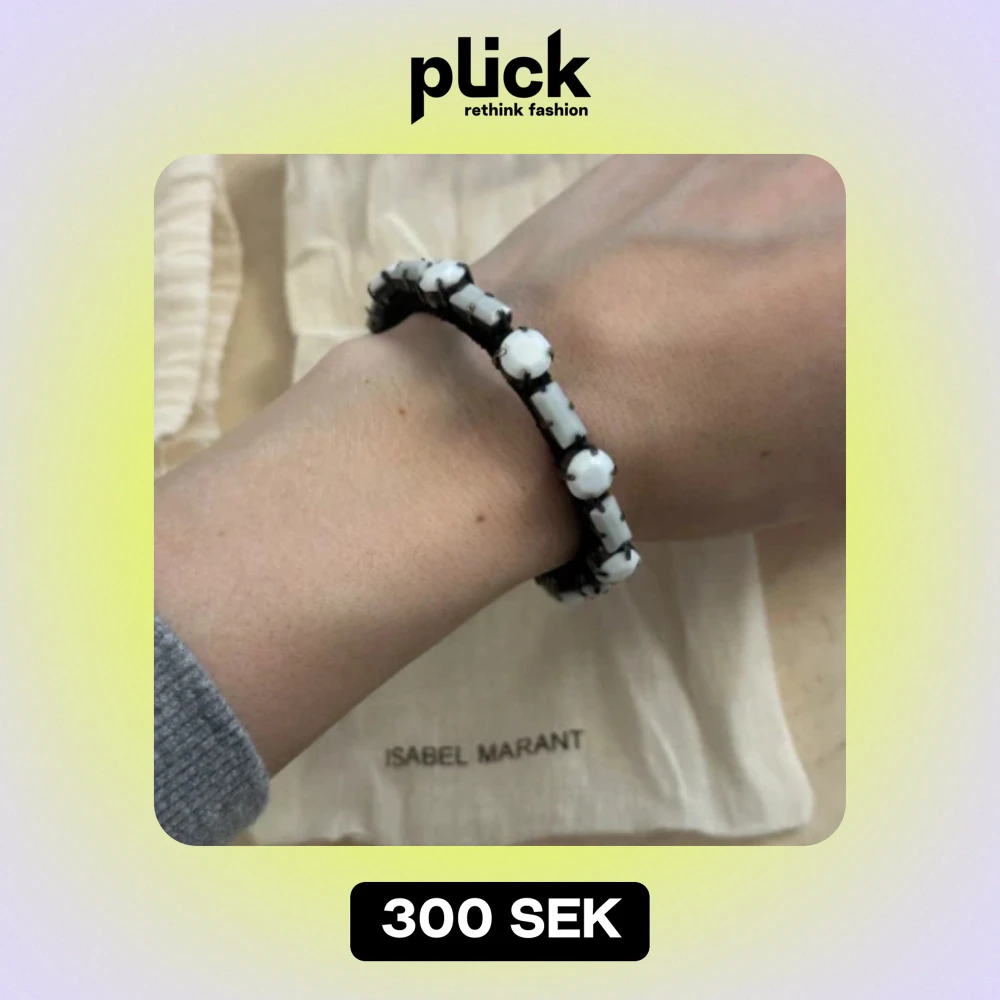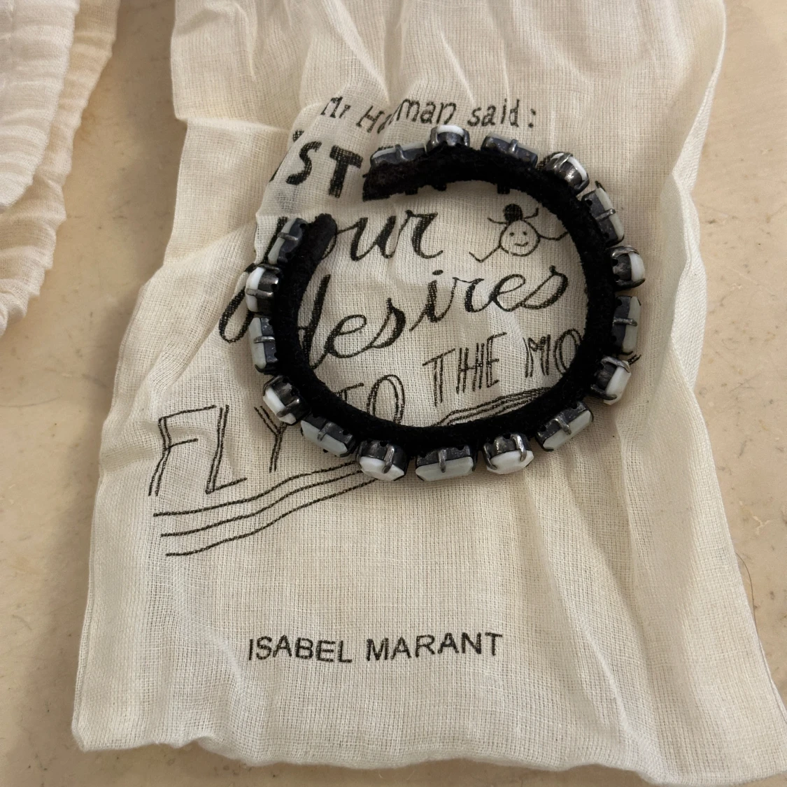 Oanvänt armband med vita stenar från Isabel Marant. Tillhörande smyckespåse ingår. Armbandets storlek justeras själv.