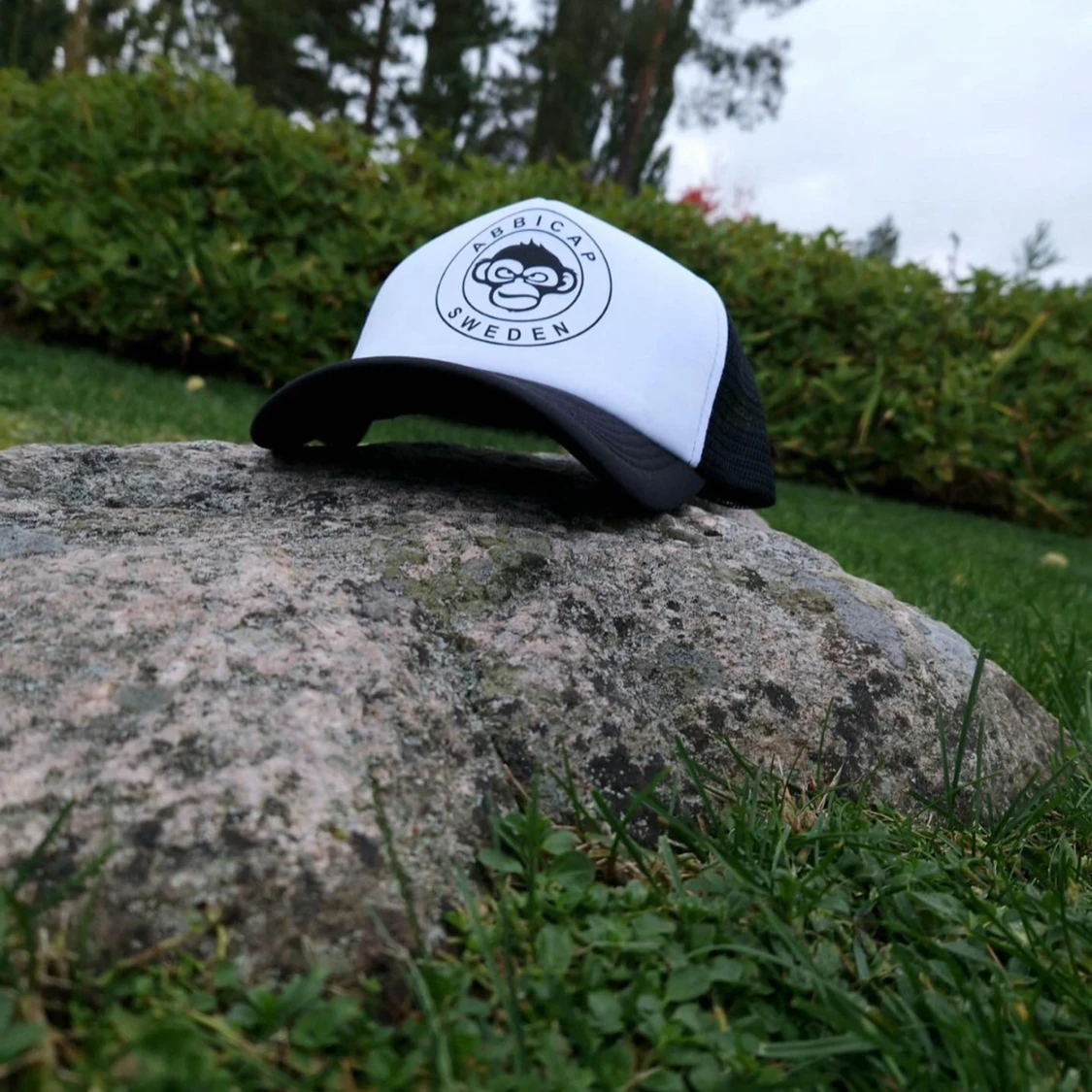 Snygg truckerkeps från ABBICAP Sweden med svart nät baktill och vit frontpanel. Kepsen har ett tryckt apmotiv och rundad skärm. Perfekt för dig som vill ha en cool och avslappnad stil.