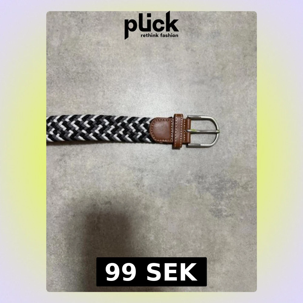 Snyggt flätat bälte i svart, vitt och grått med bruna skinn-detaljer vid spännet och änden. Bältet har ett klassiskt metallspänne och passar perfekt till jeans eller chinos för en stilren look.