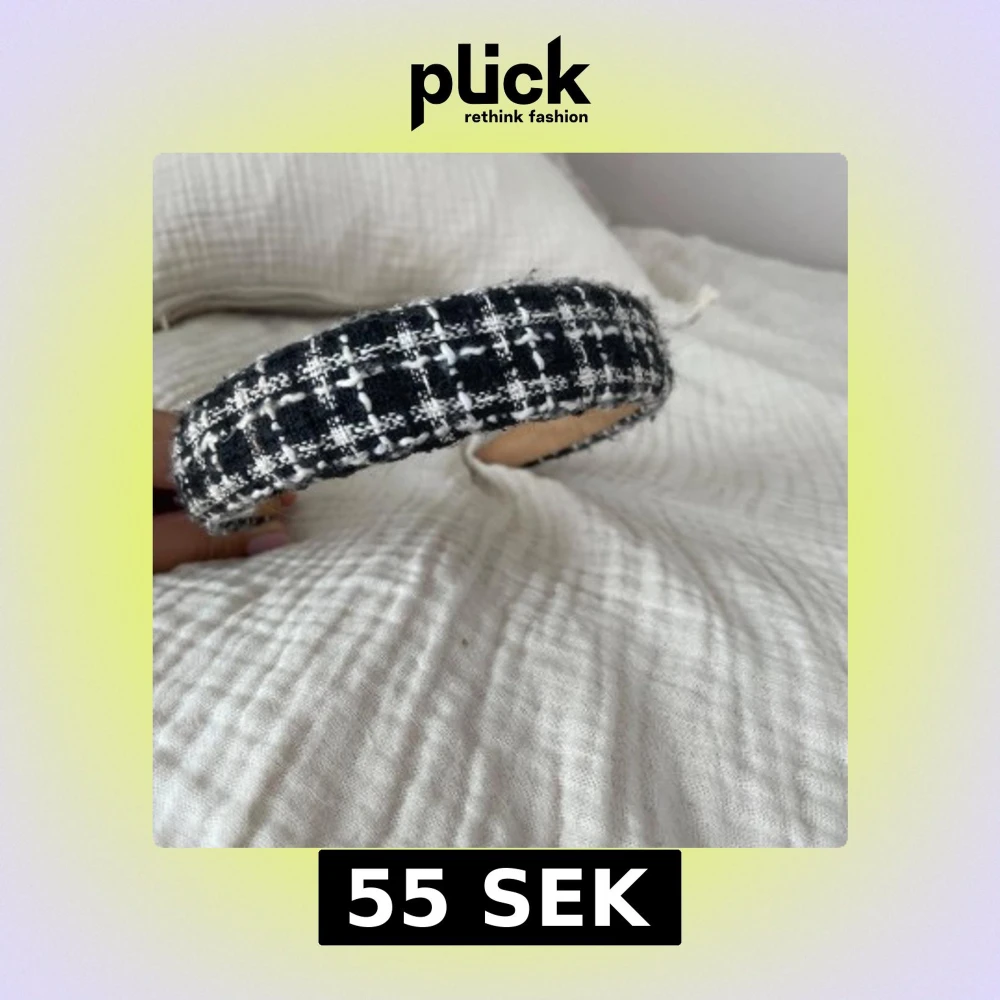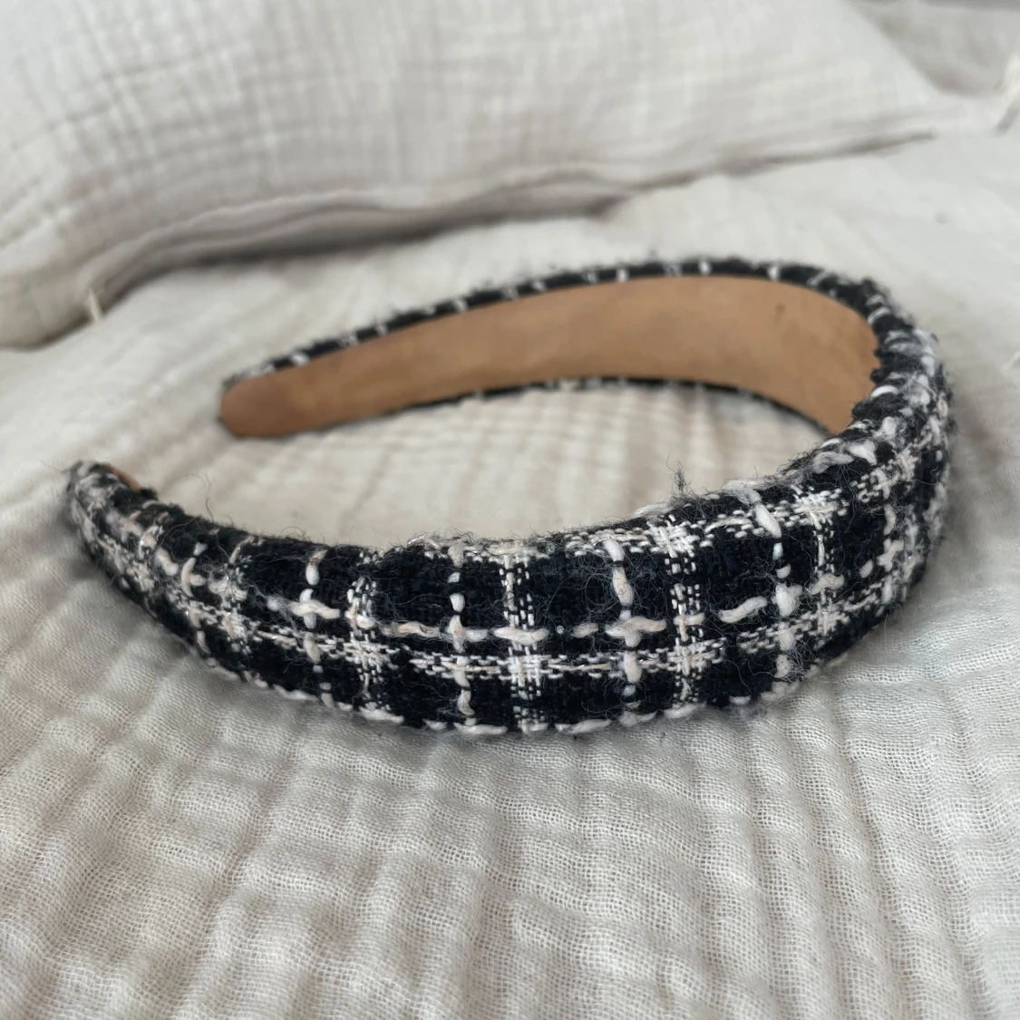 Trendigt diadem med svartvitt rutigt mönster och bred modell. Ytan är i en grovstickad ullmix.