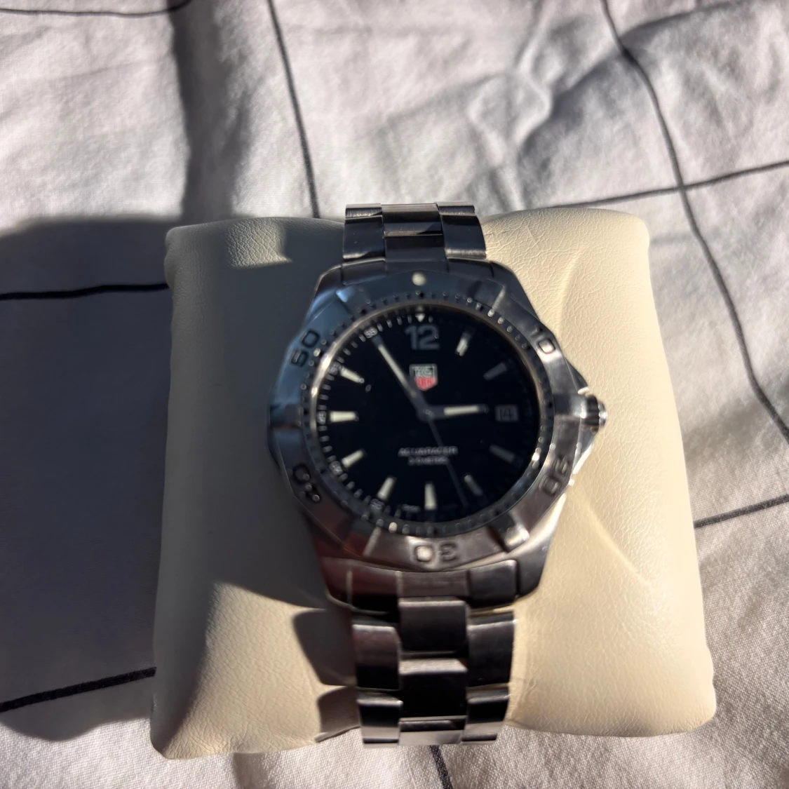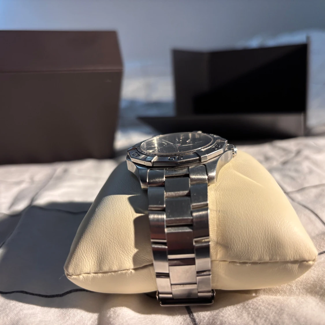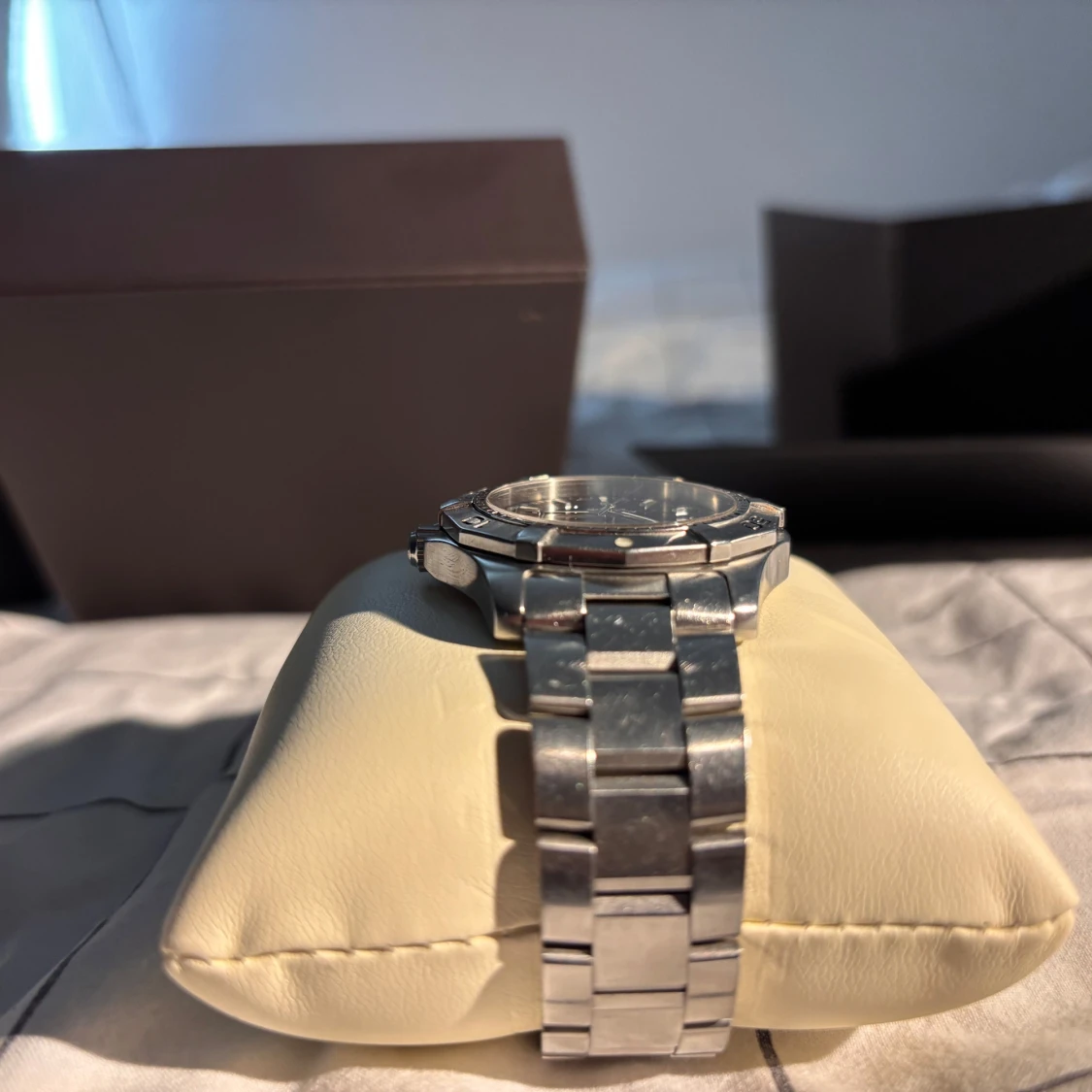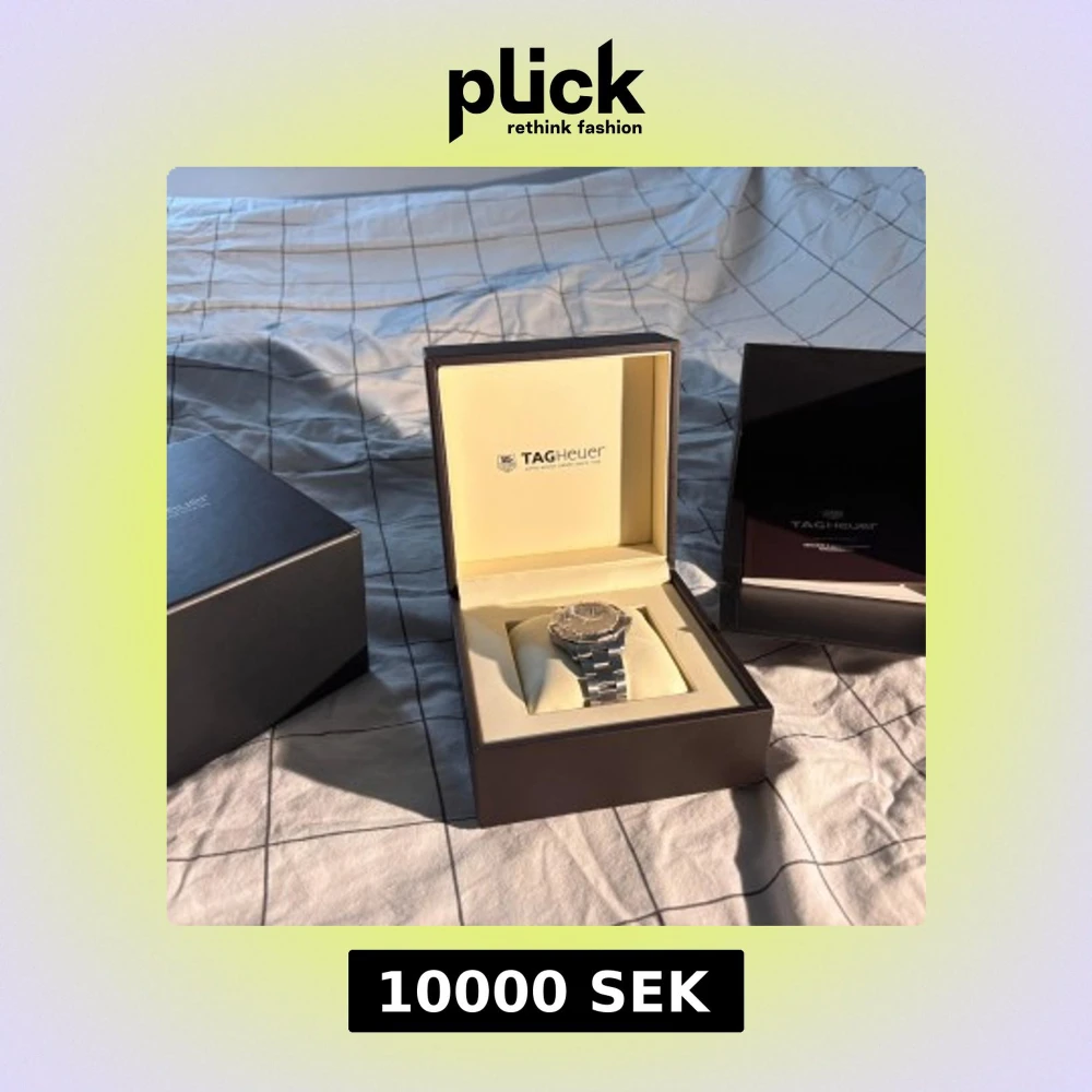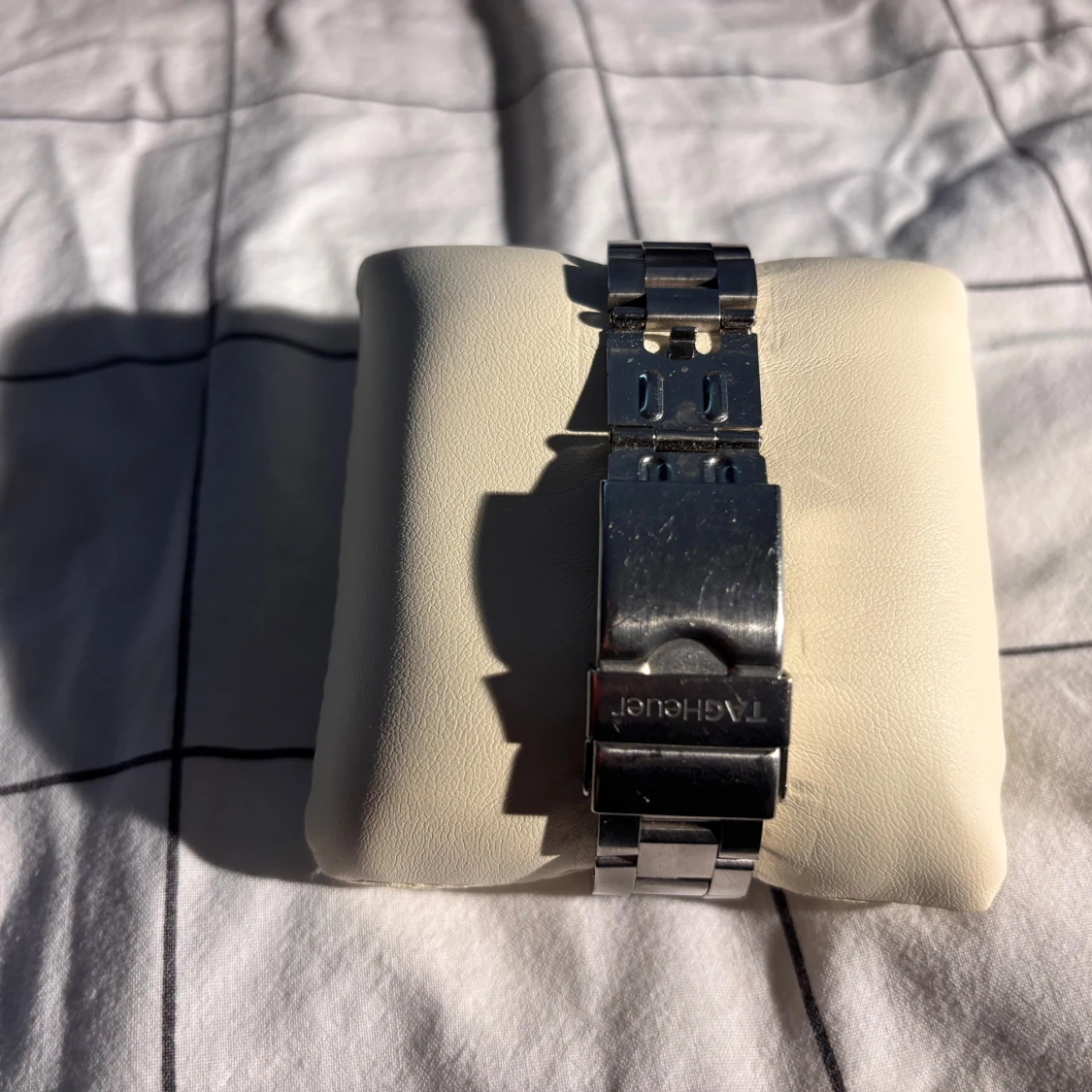 Säljer en elegant silverfärgad klocka från TAG Heuer med svart urtavla och datumvisning. Klockan har en robust länkarmband i metall och kommer i originalförpackning. Perfekt för den stilmedvetna!