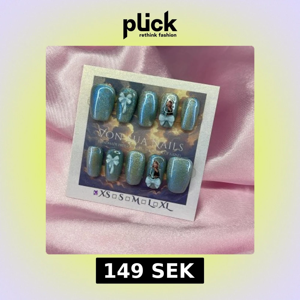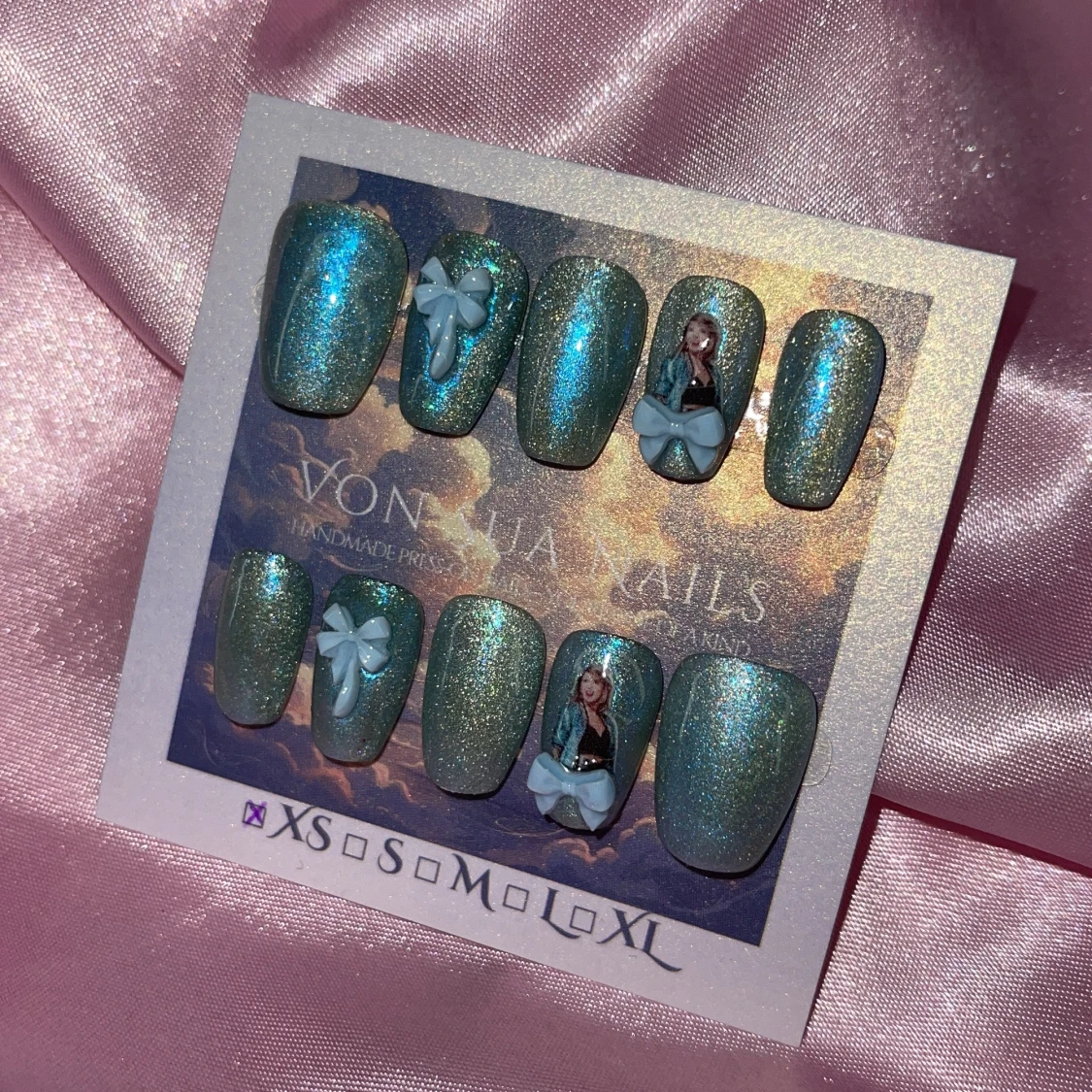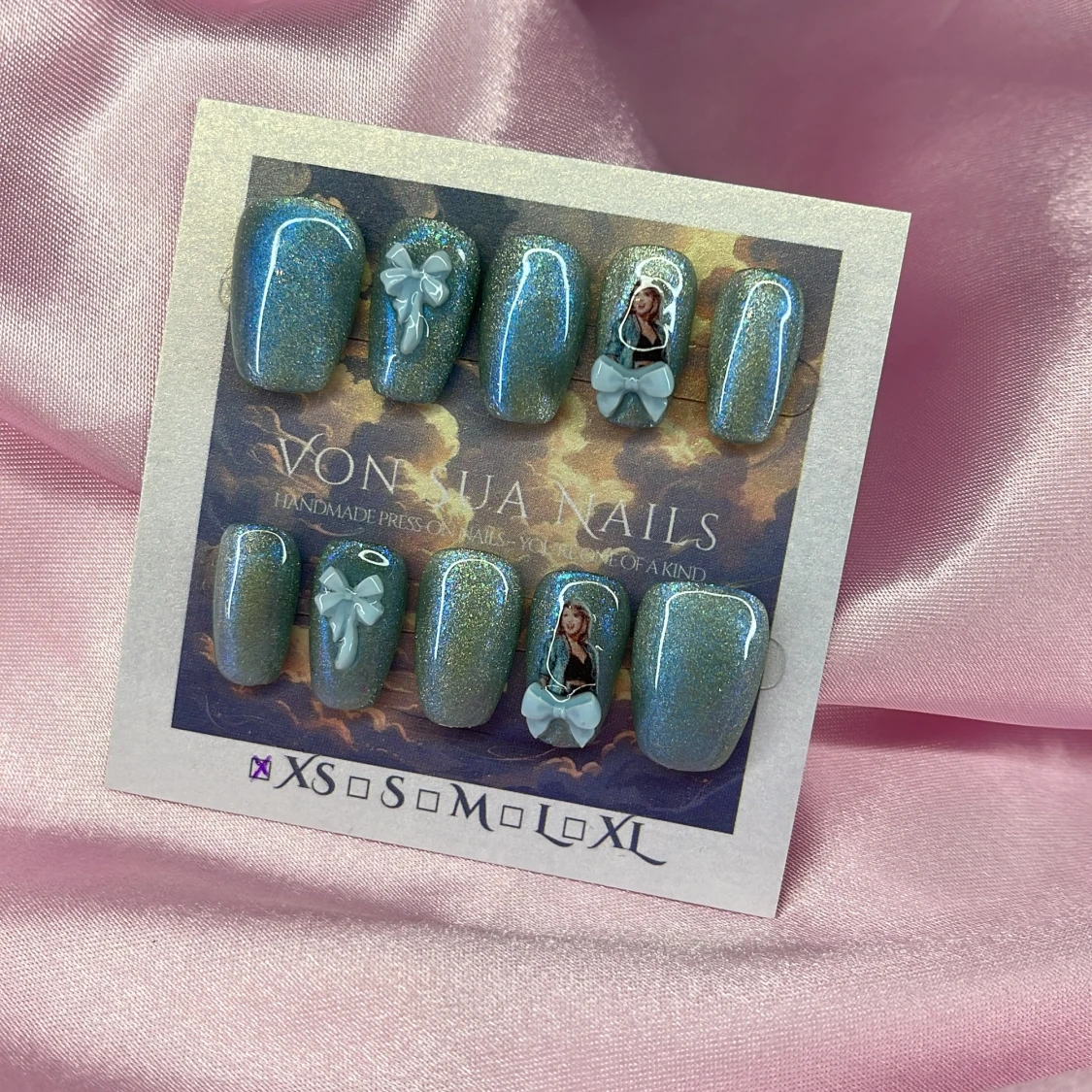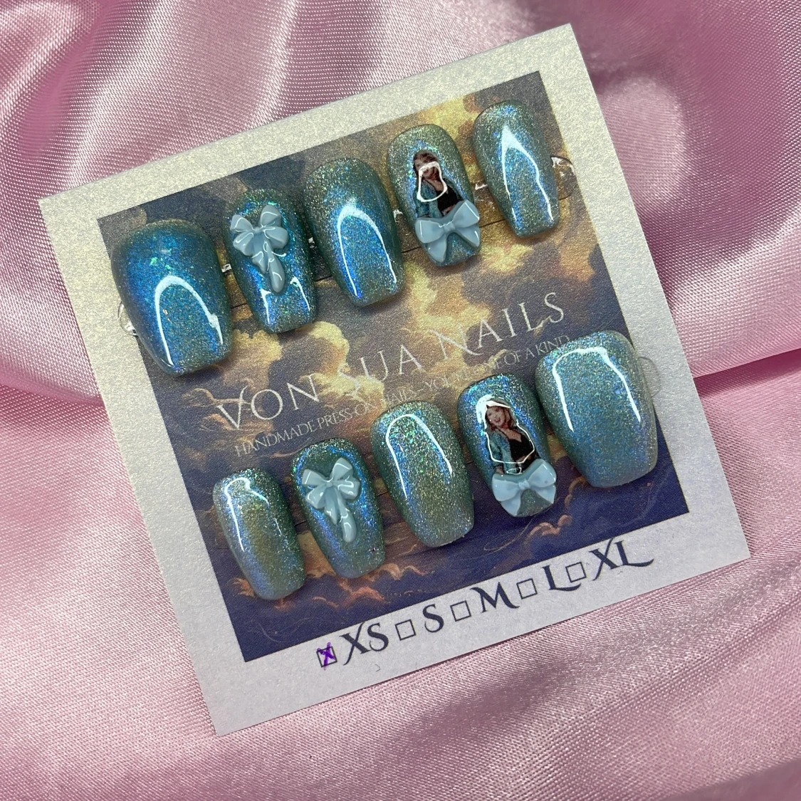 Handgjorda press-on naglar i skimrande blått med cateye effekt. Dekorerade med 3D-ljusblå rosetter och bild av Taylor Swift. Naglarna har en coffin form och kommer i XS: 14 mm, 11 mm, 11,5 mm, 10 mm, 8 mm. Perfekt för dig som vill ha en unik och söt look.