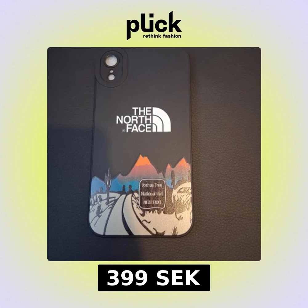 Snyggt svart mobilskal från The North Face med coolt motiv av Joshua Tree National Park och färgglada berg i orange, blått och beige. Skalet har en stilren design med vit logga och illustration av landskap.