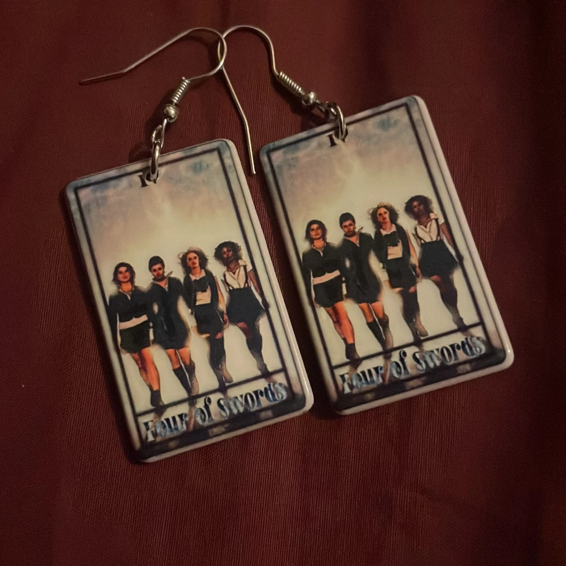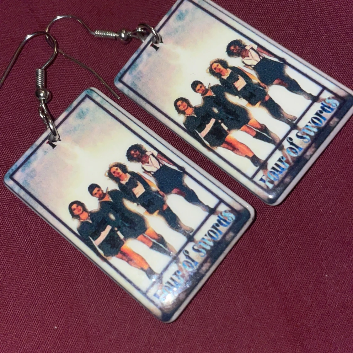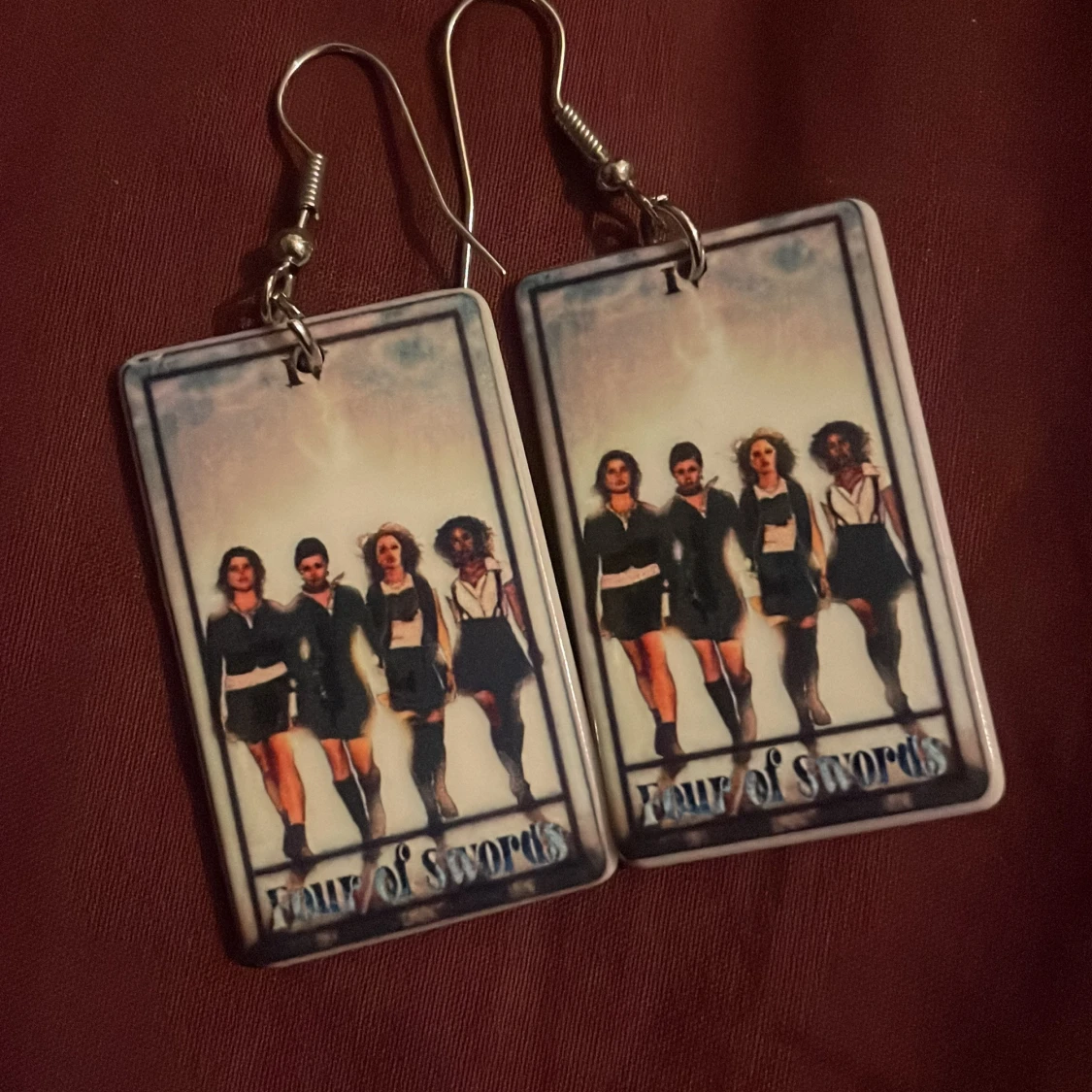 Unika örhängen med rektangulära plattor som har ett tryck av The Craft. Texten 'Four of Swords' syns längst ner. Perfekt för den som vill ha något annorlunda och iögonfallande.