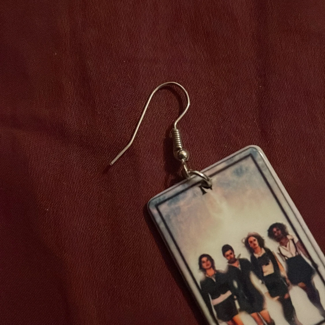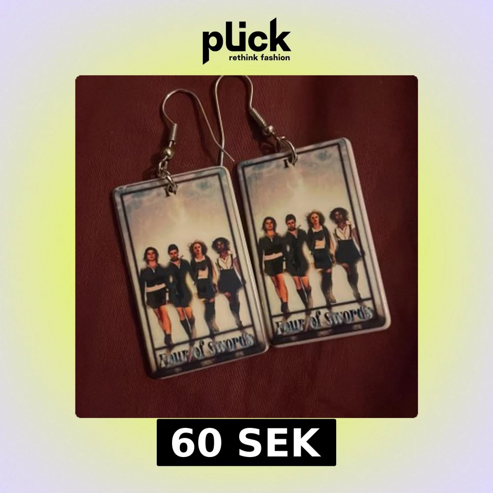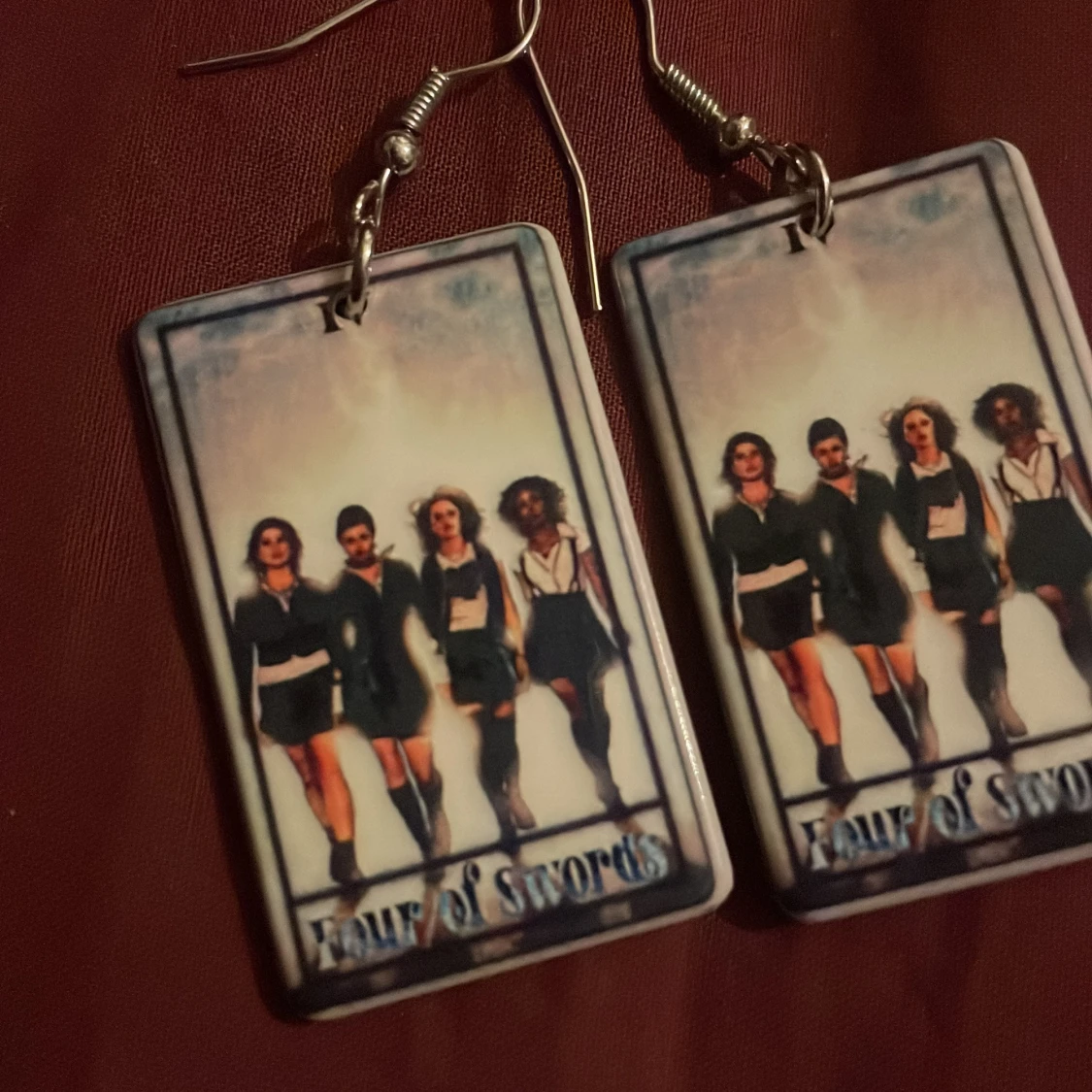 Unika örhängen med rektangulära plattor som har ett tryck av The Craft. Texten 'Four of Swords' syns längst ner. Perfekt för den som vill ha något annorlunda och iögonfallande.