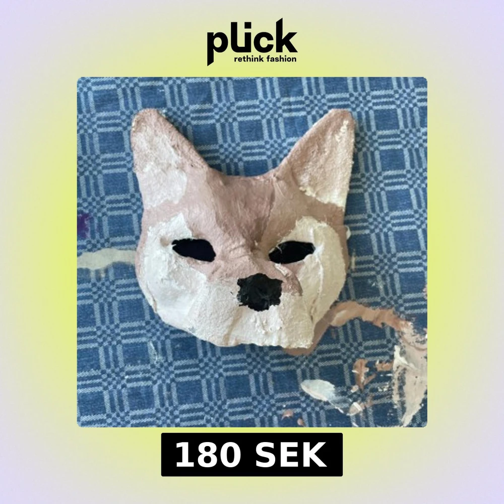 Unik handgjord rävmask i papp med målade detaljer i beige och vitt. Masken har spetsiga öron, svart nos och elastiskt band för att sitta på plats. Insidan har nät för ögonen för bättre komfort.