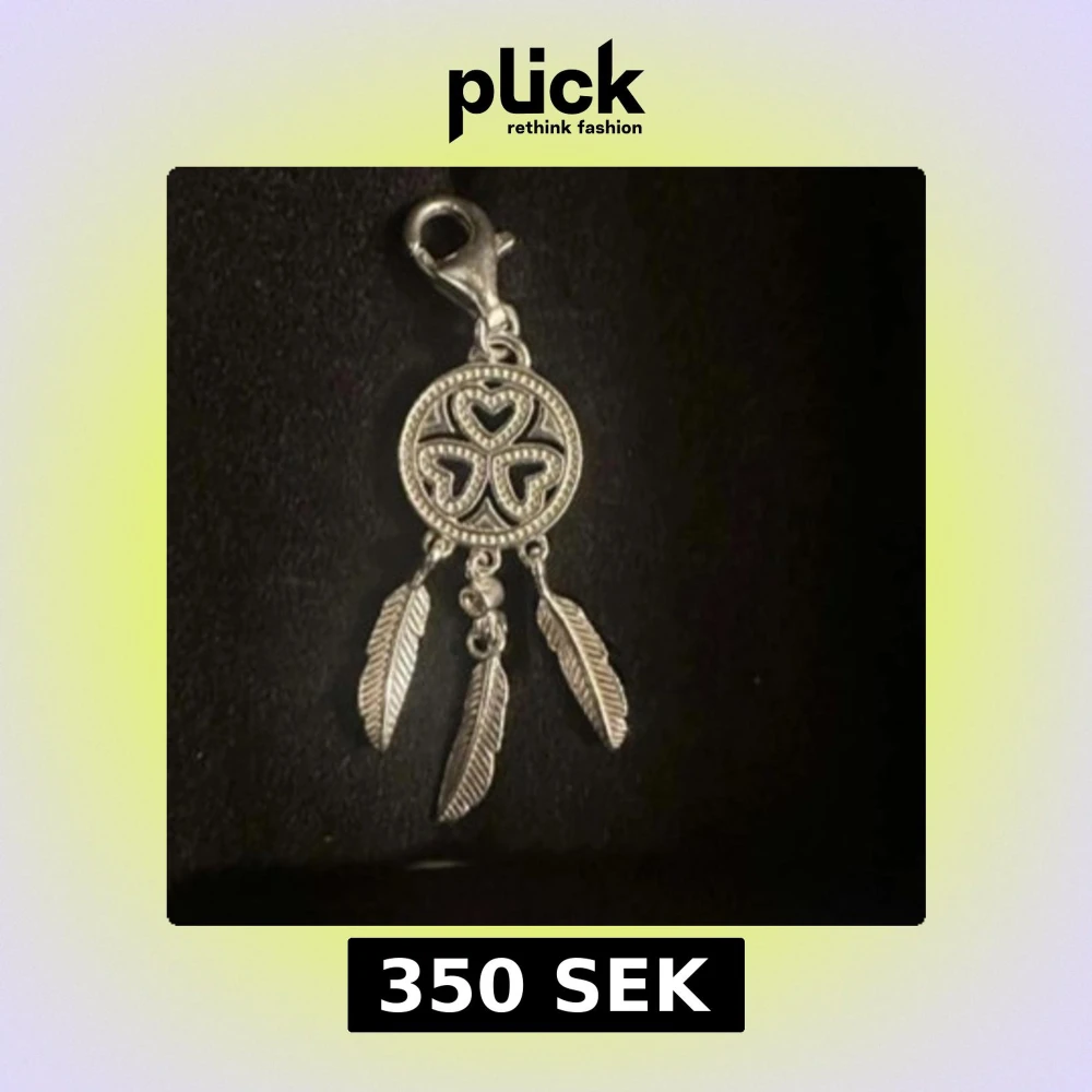 Unik silverfärgad berlock med rund form, tre hängande fjädrar och detaljerade hjärtmönster i mitten. Perfekt att fästa på halsband eller armband för en personlig touch.