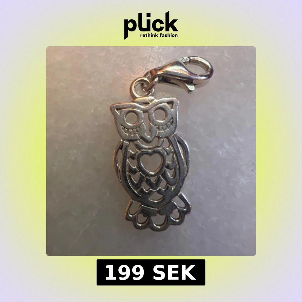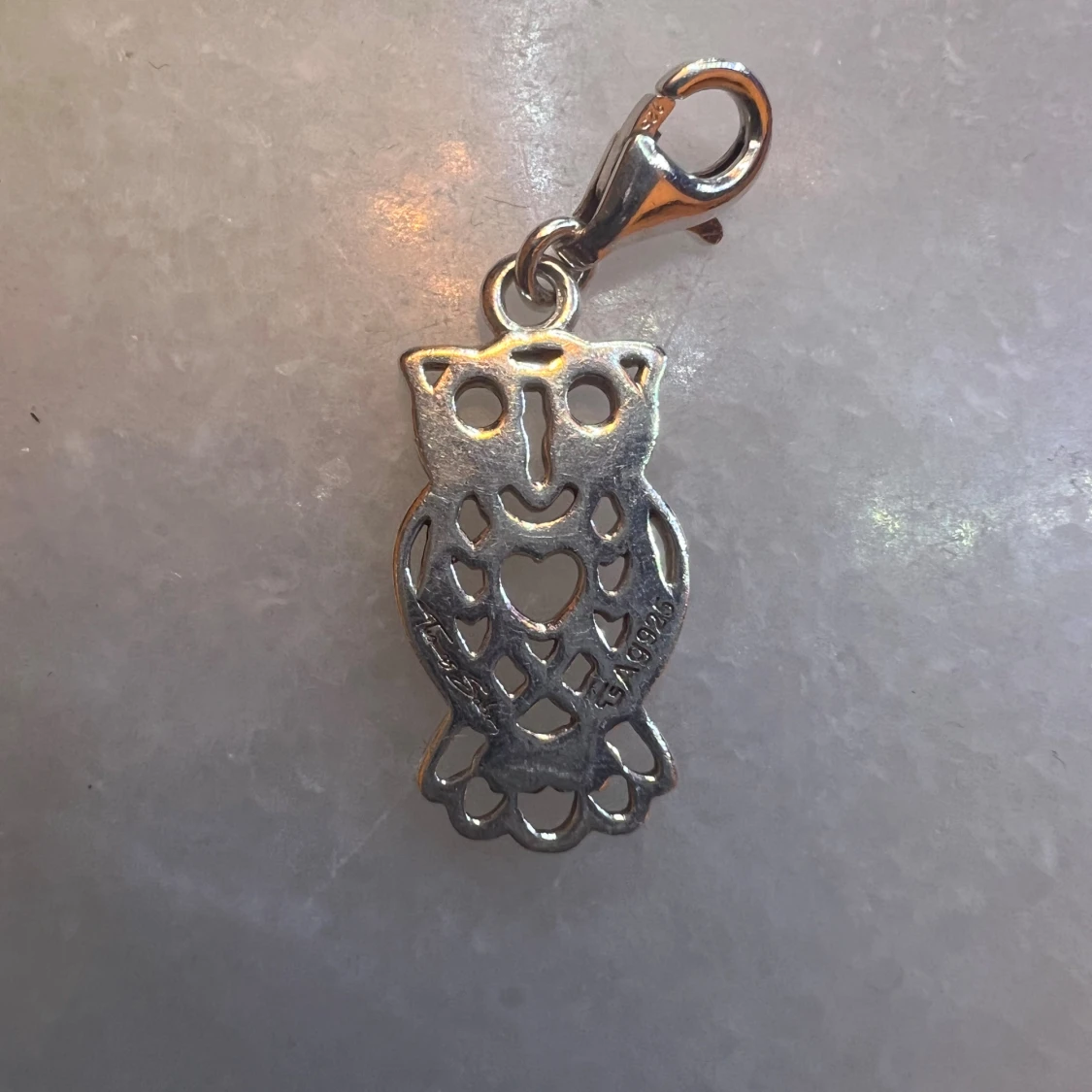 Cool berlock i form av en uggla med utskurna detaljer och ett hjärta i mitten. Silverfärgad metall med karbinhake, perfekt att hänga på halsband eller armband för en personlig touch.