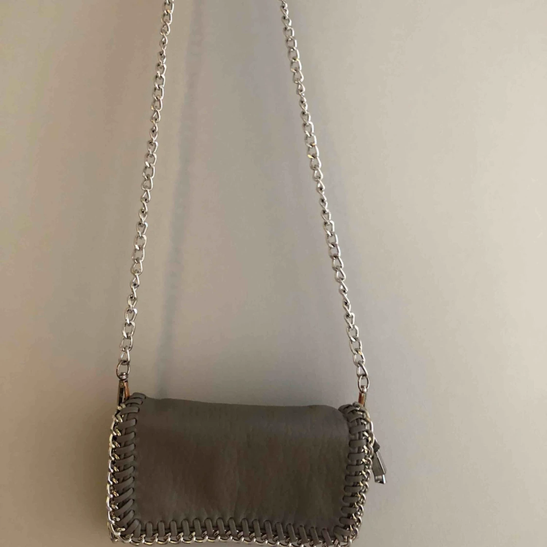 Axelremsväska från ”Tiamo” i skinnimitation kantad med silverlänk. Avtagbar axellänk gör att den kan bäras även som en clutch. Färgen har gått bort lite på slutet av länken, se bild 1,3. Överlag väldigt fin! Nypris 450kr