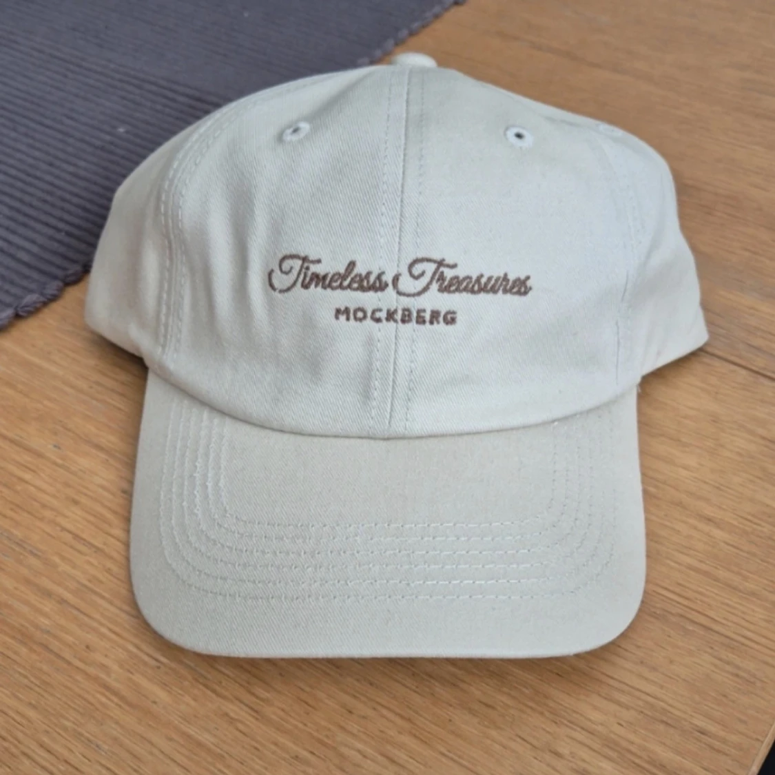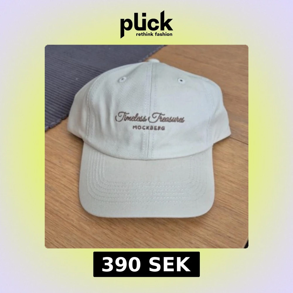 Snygg beige keps från Mockberg med broderad text 'Timeless Treasures' framtill. Hade funkat jättebra till hösten då den broderade texten är brun✨️ HELT NY MED LAPPEN KVAR‼️