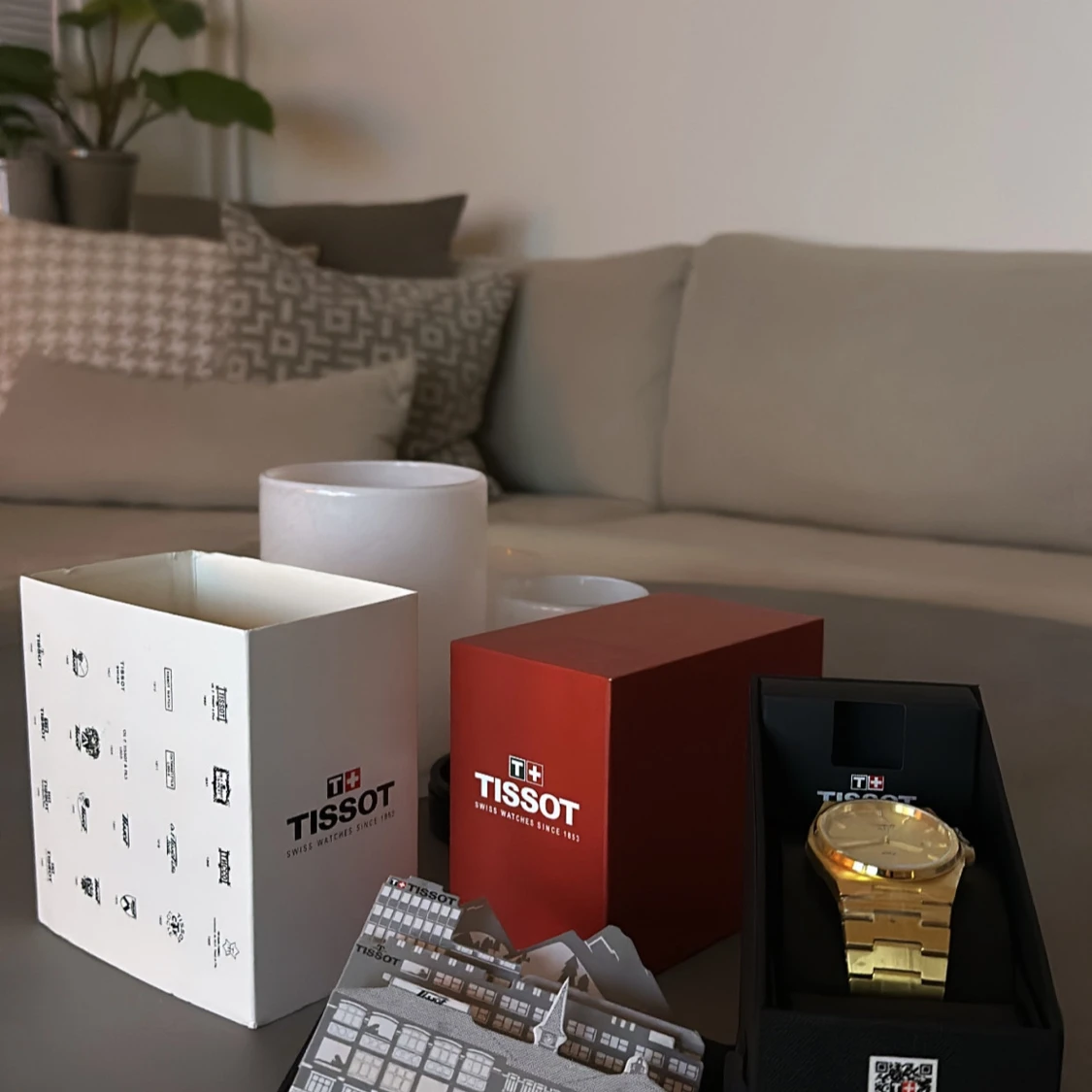 Elegant guldfärgad klocka från Tissot med datumvisning. Klockan har en stilren design med ett armband i rostfritt stål. Perfekt för den som söker en tidlös accessoar. Klockan är aldrig använd och har fortfarande plasten kvar runt. Alla tillbehören på bilderna medföljer.