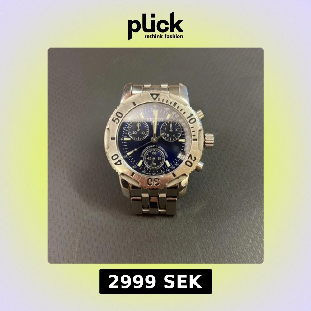 Snygg Tissot PRS200 kronograf med blå urtavla och silverfärgat armband i metall. Klockan har flera subdials, tydliga siffror på boetten och robust länkarmband med lås där PRS200 är ingraverat. Perfekt för dig som gillar sportig och stilren design.