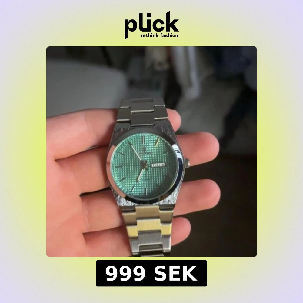Stilren klocka som liknar tissot prx med silverfärgat armband i metall och en grön, rutmönstrad urtavla. Klockan har dag- och datumvisning samt tydliga indexmarkeringar. Perfekt accessoar för dig som gillar en modern och clean look.