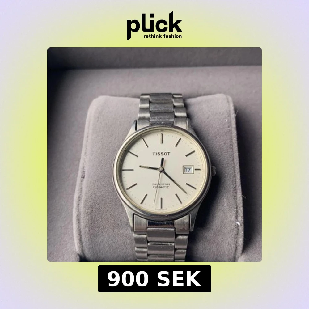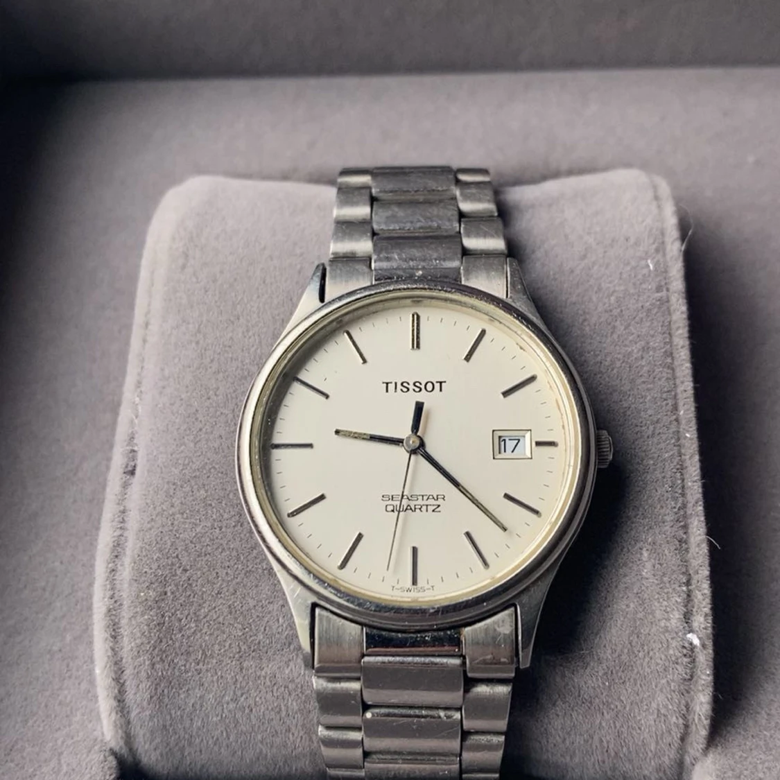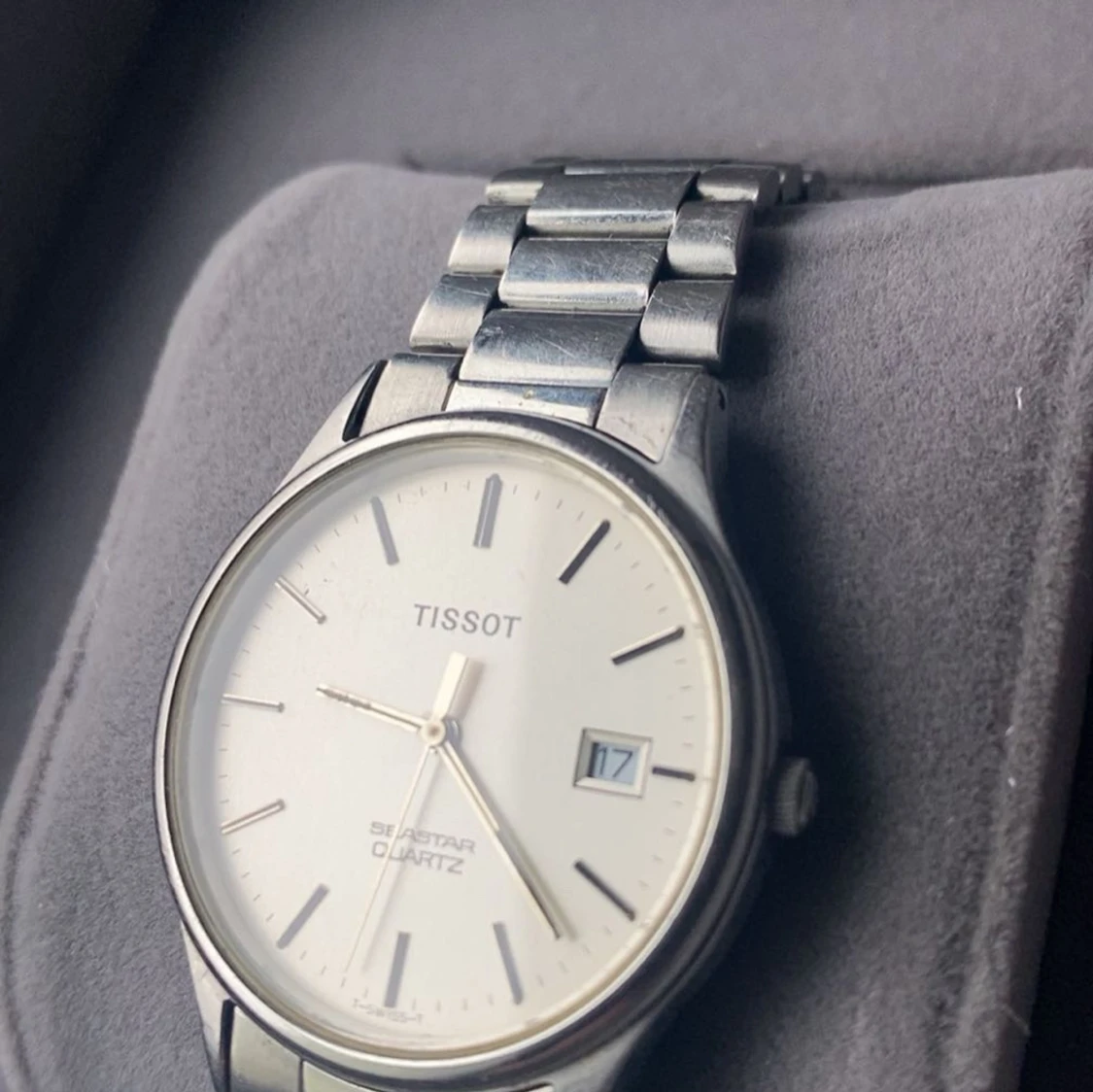 Elegant Tissot Seastar Quartz klocka med en stilren vit urtavla och datumvisning. Klockan har en klassisk design med ett silverfärgat armband i rostfritt stål. Perfekt för den som söker en tidlös accessoar.